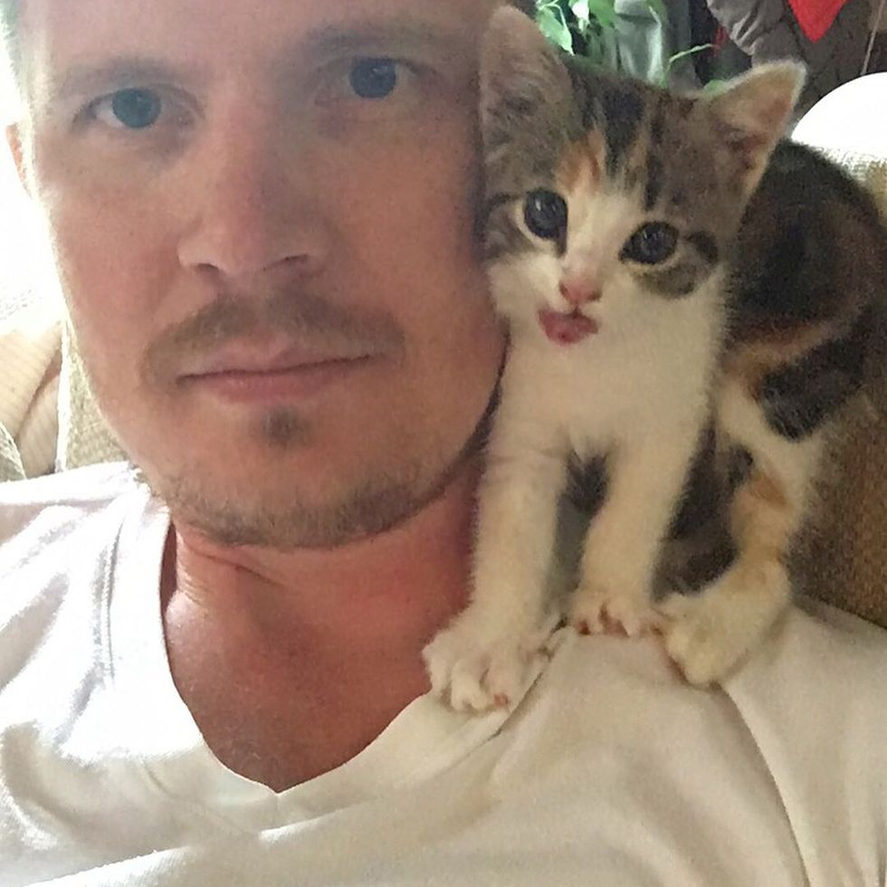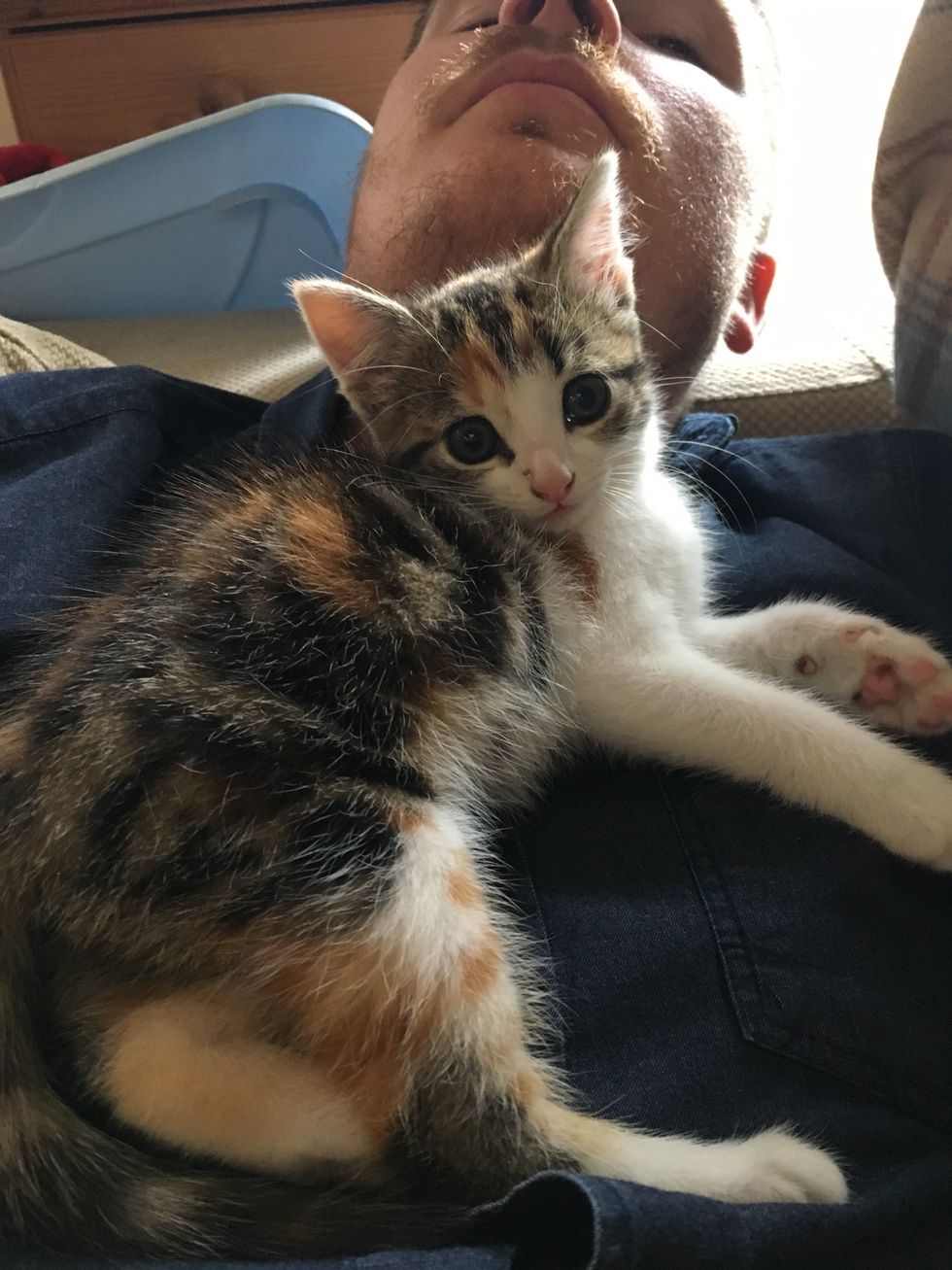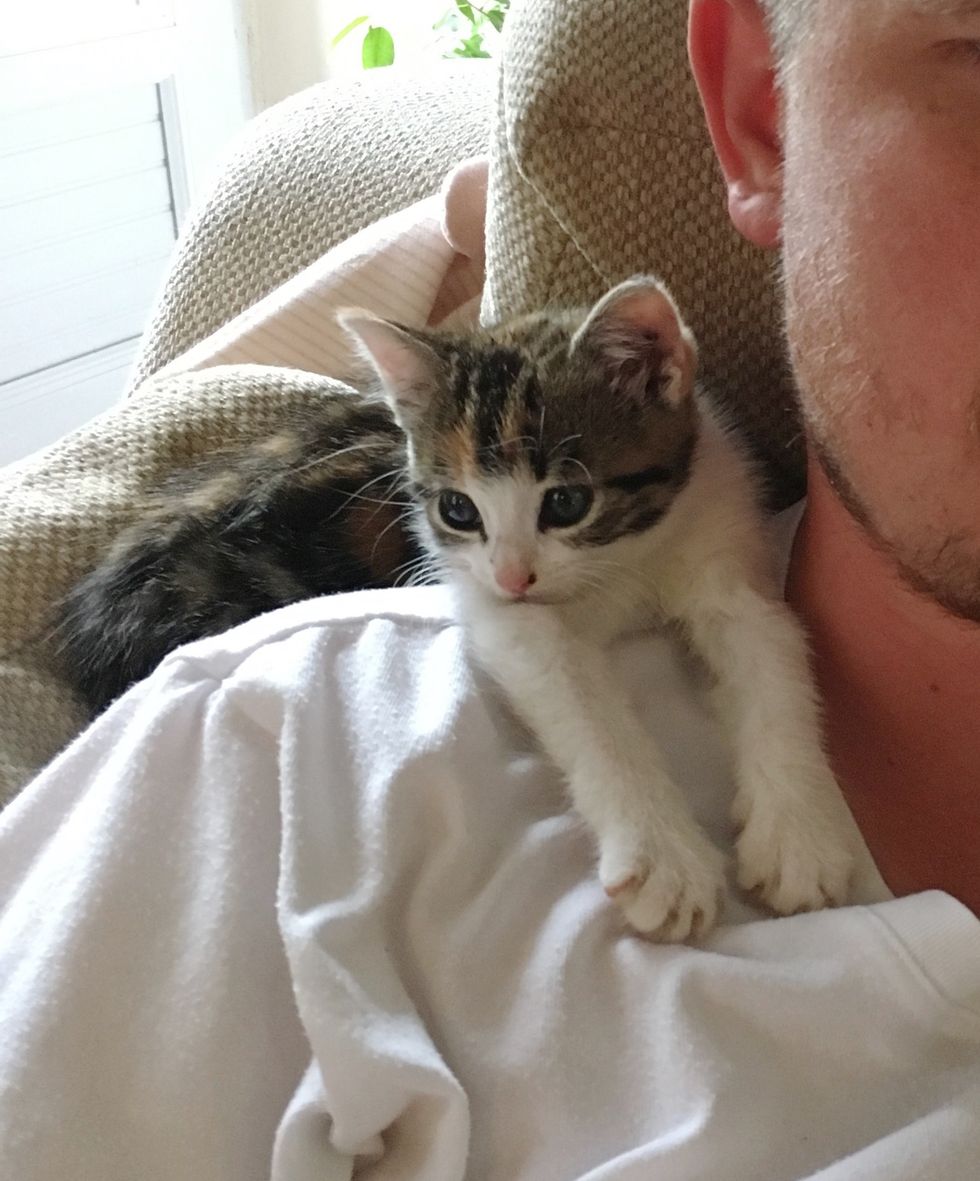 The kitten jumped right into her arms as if she was ready to go home with them. "She spent her first evening giving my husband a thank-you grooming session."