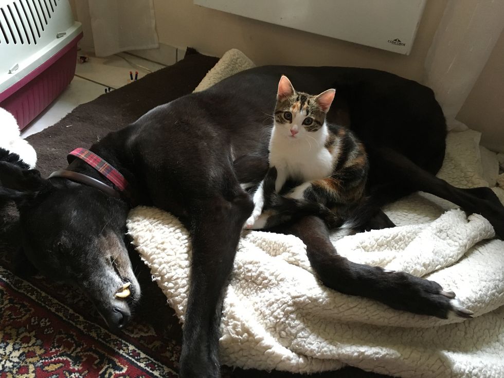 Mini Kitty snuggles up to her canine buddy for a nap.