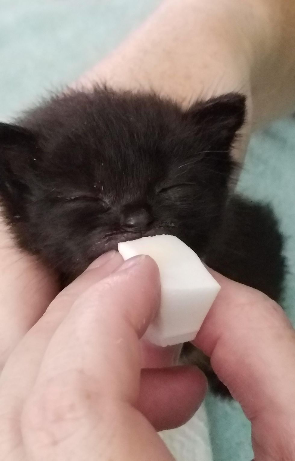 "Early the next morning at around 3AM, my wife remembered that the Bat Sanctuary feeds orphaned bat pups by soaking latex free sponges in formula. She cut a wedge sponge in half, trimmed it down, put formula in the tip, and gently placed it in the kitten's mouth. The kitten latched on and started eating."