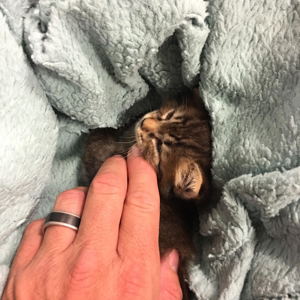 The kitten was alone without her mother. She was so tiny that she fit perfectly in their hands. They couldn't leave the kitten there fending for herself, so they took her along on her first trip home.