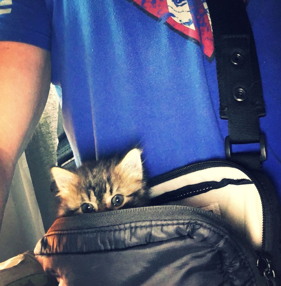Two weeks after the rescue, she demanded to be carried around in her human's bag.
