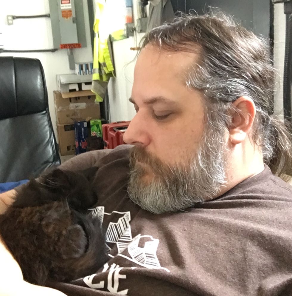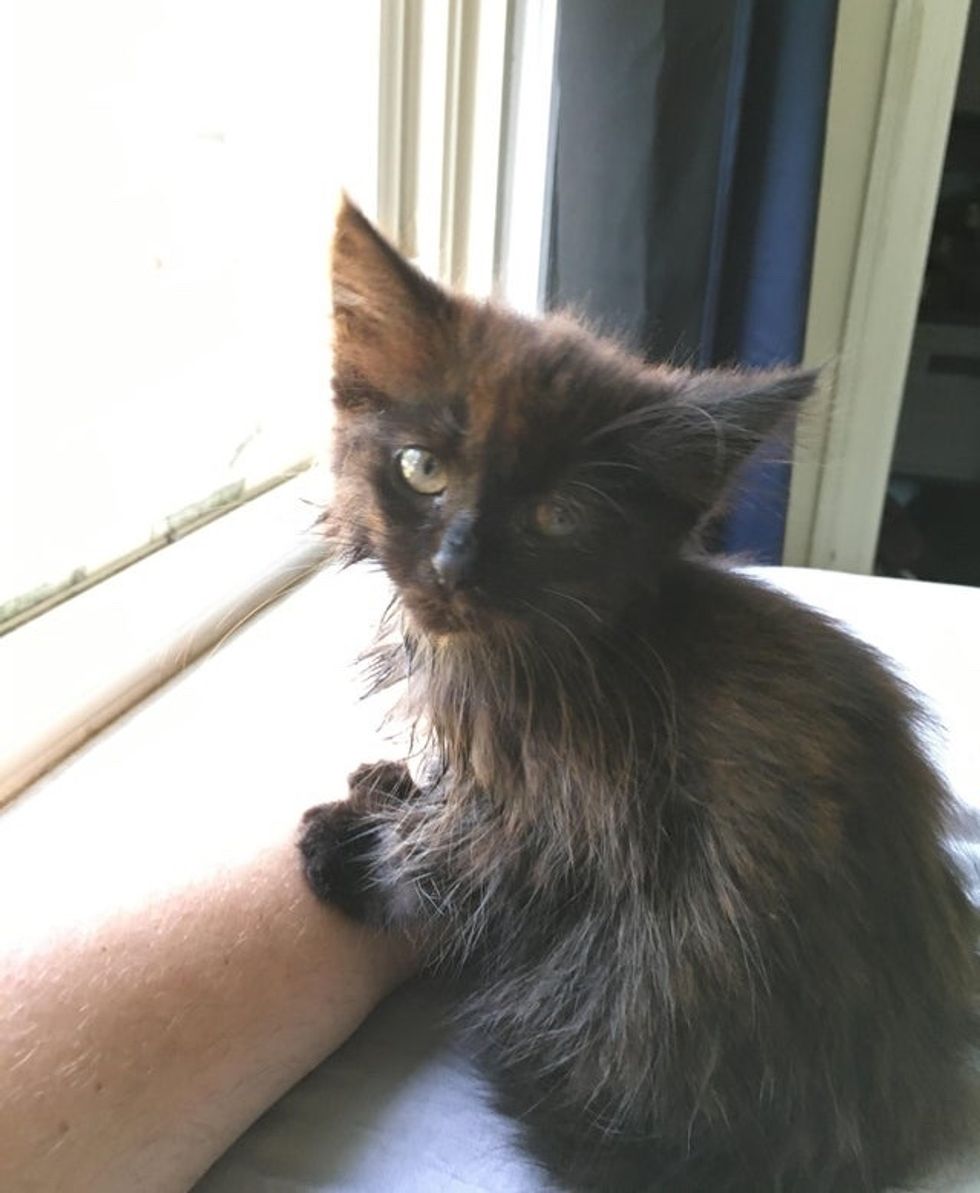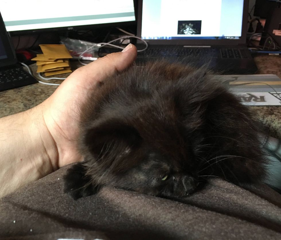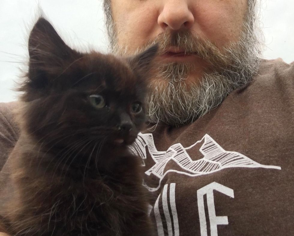 "I heard a teeny squeaky mew and I turned around. There was a little black floof sitting in the parking area," Tony told Love Meow. "I said, 'Kitty!' He just raced over to me as quickly as his little nubby legs could go and climbed me so fast I just laughed."