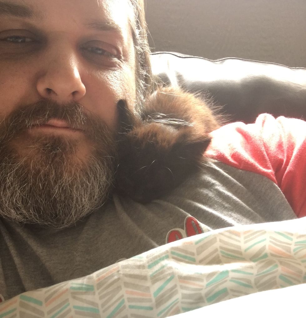 Whenever Spud woke up, he crawled back onto his shoulders or lap for some extra TLC.