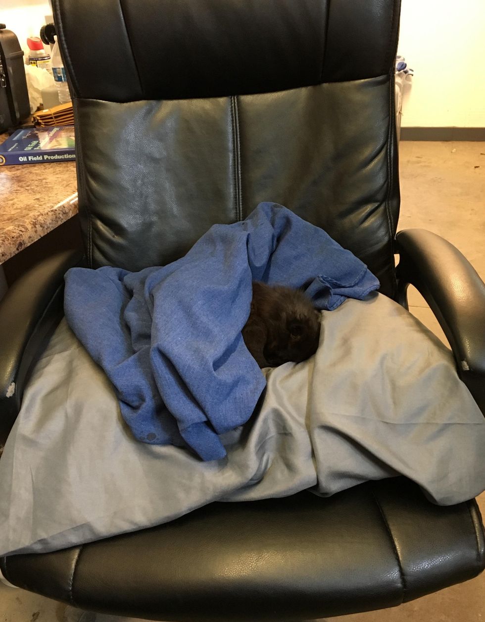 He made a makeshift bed for Spud with a pillow and a shirt as a blanket in his chair, so he could continue working while the kitten snoozed through the day.