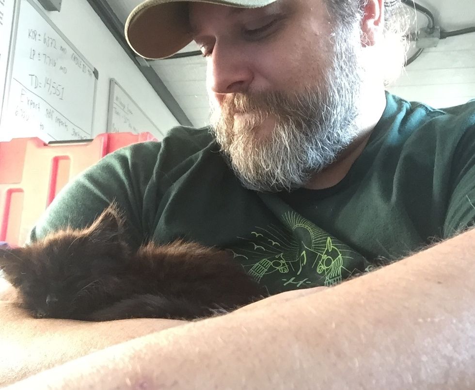 Tony had to stay in the field for a few more days until he could bring the kitten home. "If I left the lab, he would get up and look for me. I came back in, and this little ball of fluff rocketed toward me, climbed me again and fell back asleep," Tony said.
