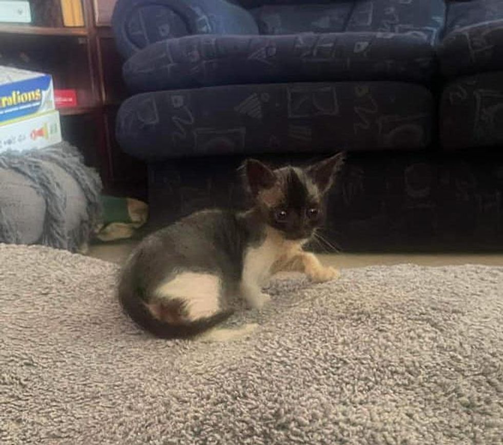 A kitten began to grow back his fur and look like a cat again after being found in a massive storm.