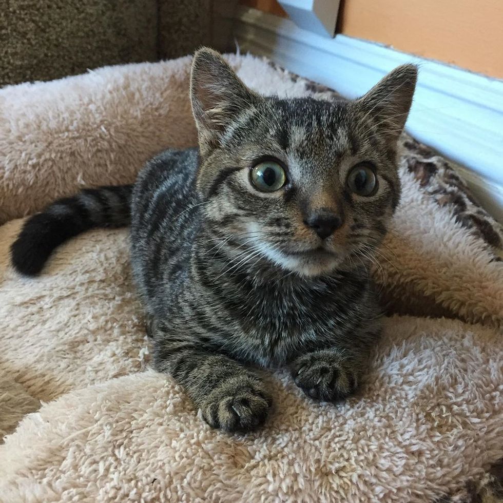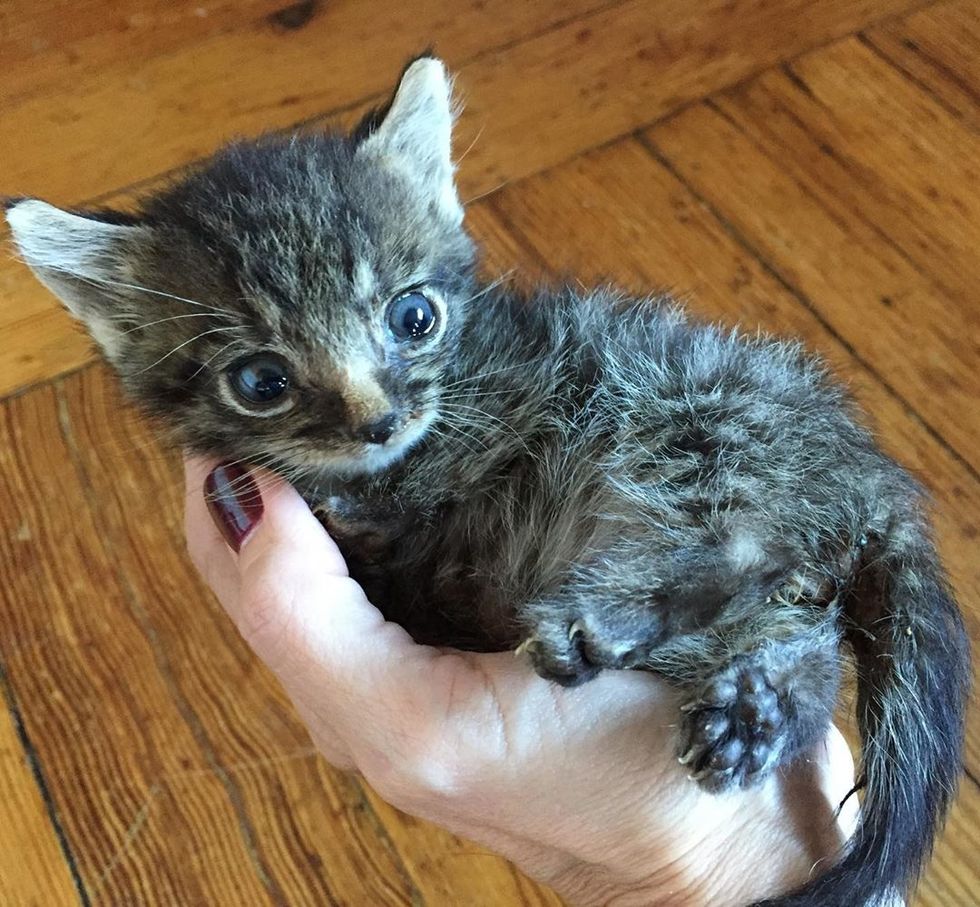 The tiny tabby whose name is Pill Pug, was five weeks old but only weighed about eight ounces, half the size of his litter-mates.