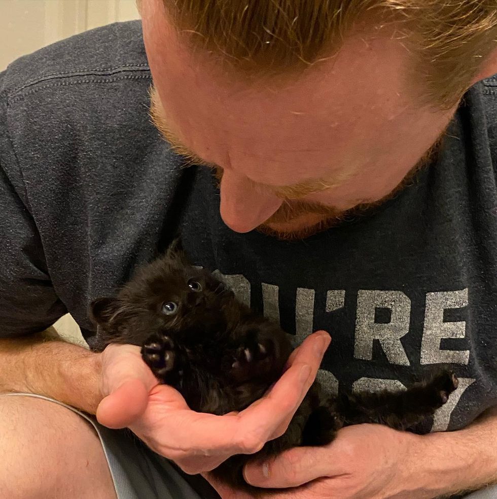 The little panther kitty is thriving and happy to have a foster family that adores him to bits. He looks at them with those big doe eyes that no one can say no to.