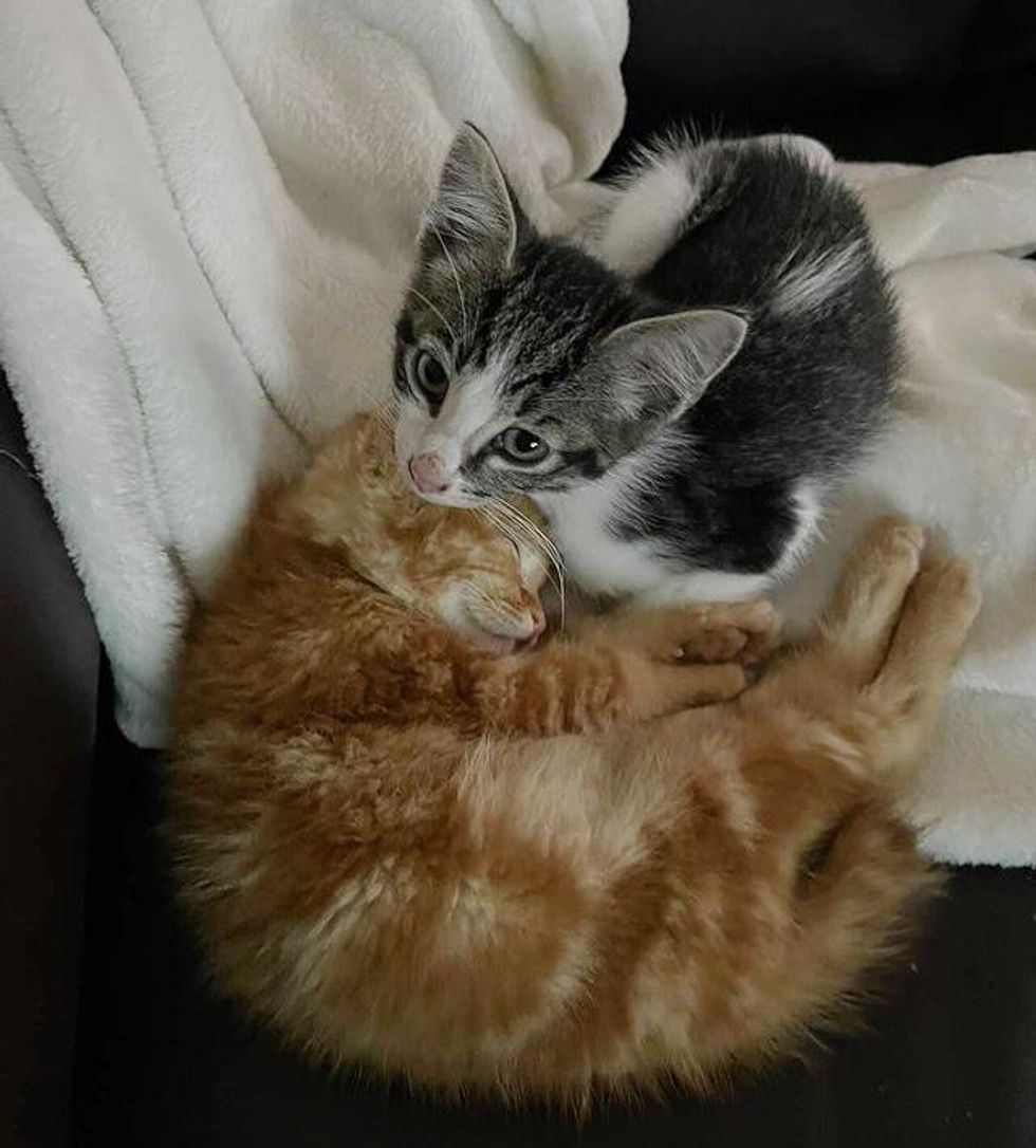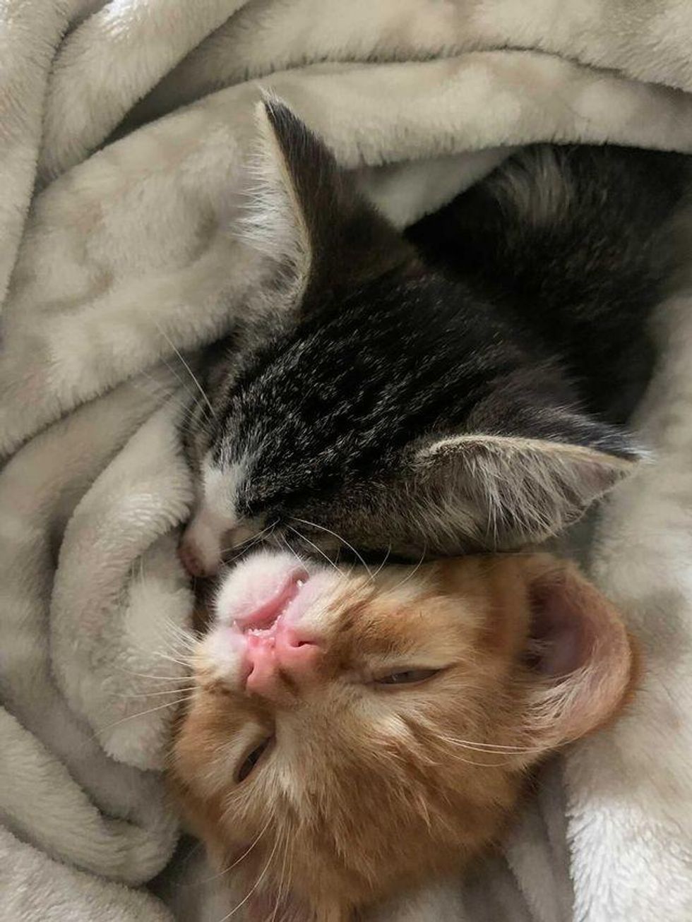 The two kittens found each other in foster care, and quickly became best friends. Theodore is so happy to have Tiny as his constant support and companion.
