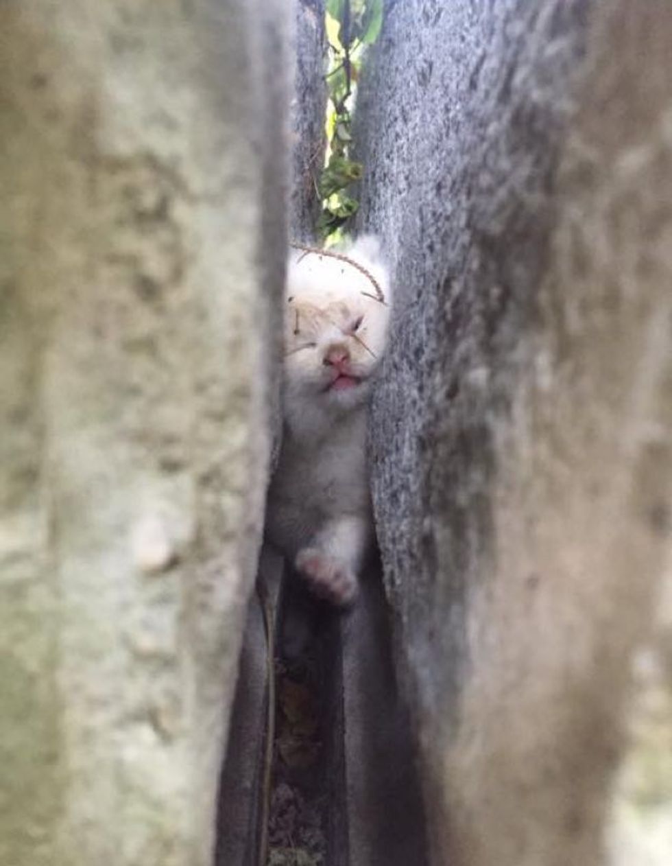 The cream-colored kitten somehow managed to become wedged in a gap between two large rocks just a few inches apart. When the homeowner from Greenville Avenue in Johnson, Rhode Island heard kitten wails, they adamantly set out to find the source, Patch reported.