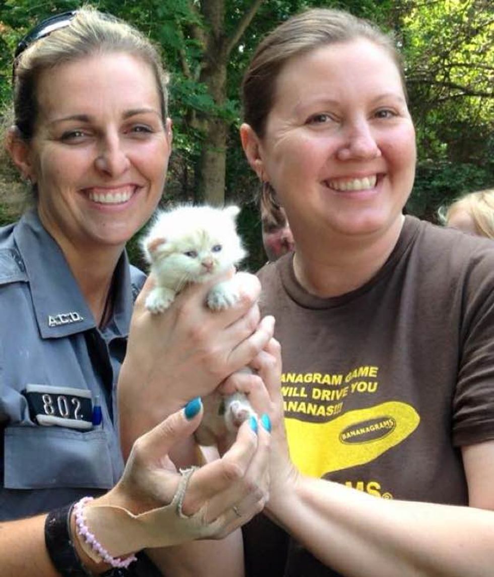 Firefighters and officers from the Johnson Police Animal Control pried the two large boulders apart with the Jaws of Life. The kitten was terrified so they took turns stroking the little furry buddy until the he was freed from the rocks.