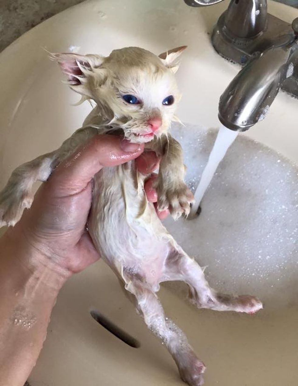 The kitten was riddled with fleas and dehydrated, "but we got some fluids right away, gave him a bath, a flea dip, and everything he needed," Medeiros said.