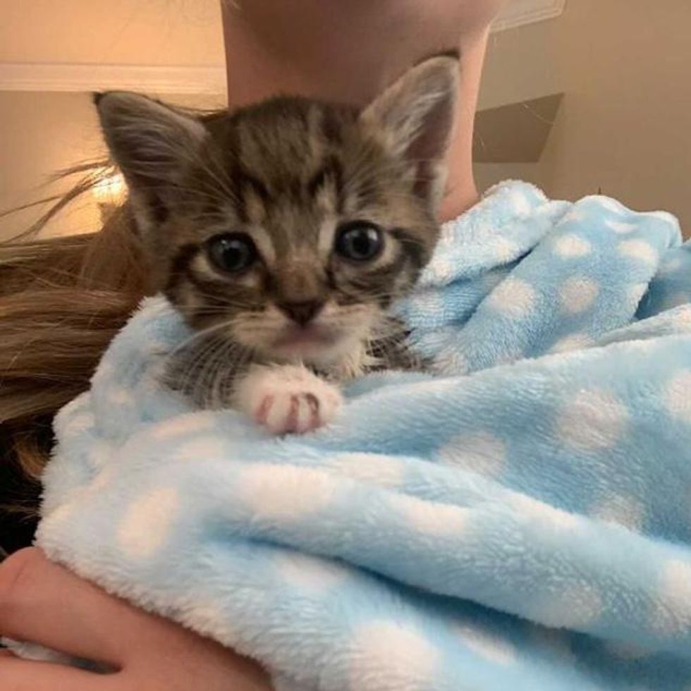 A 3-week-old tabby kitten was found abandoned outside along with his siblings. A Good Samaritan took them in and tried to care for them, but soon realized that she wasn't equipped to provide the specialized care they needed.