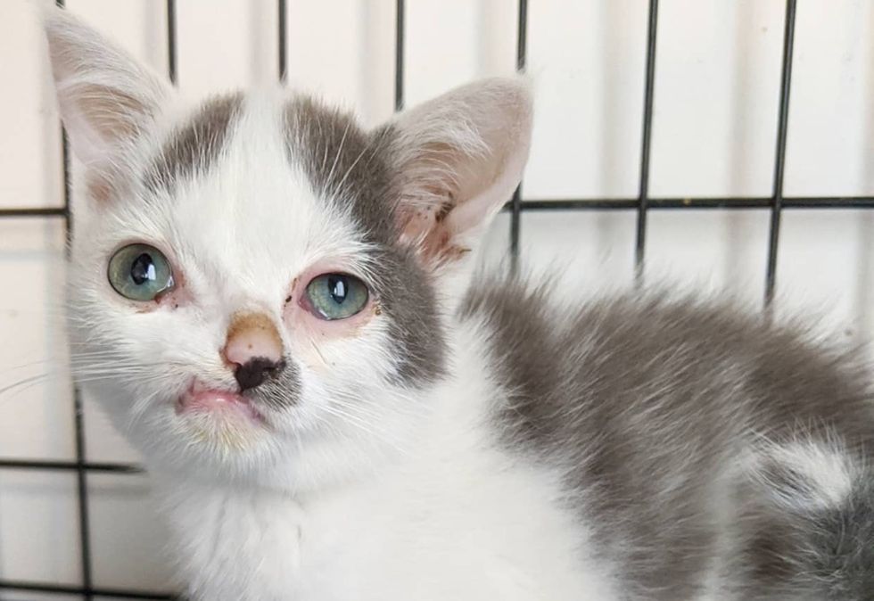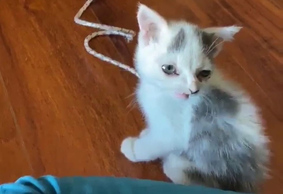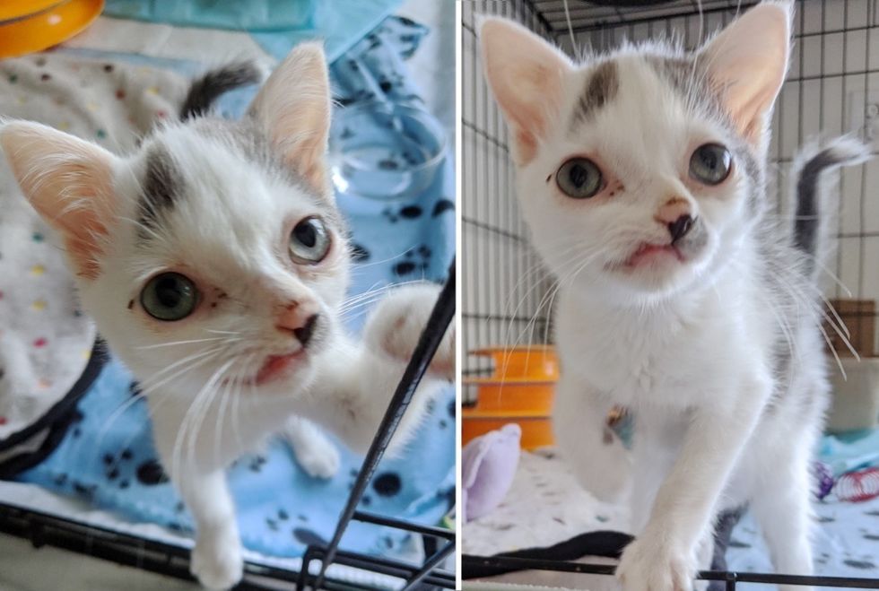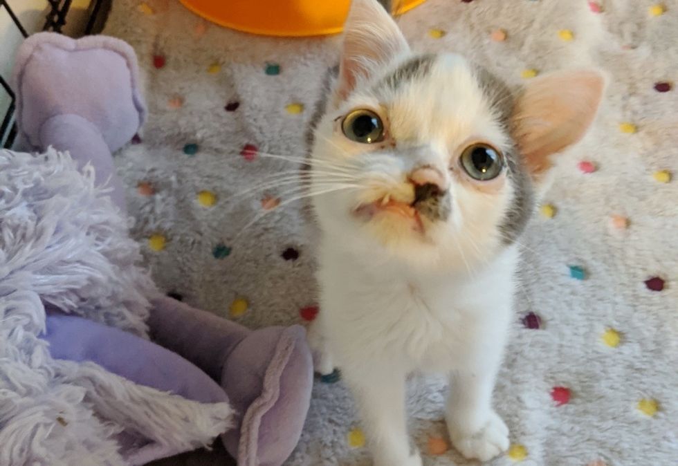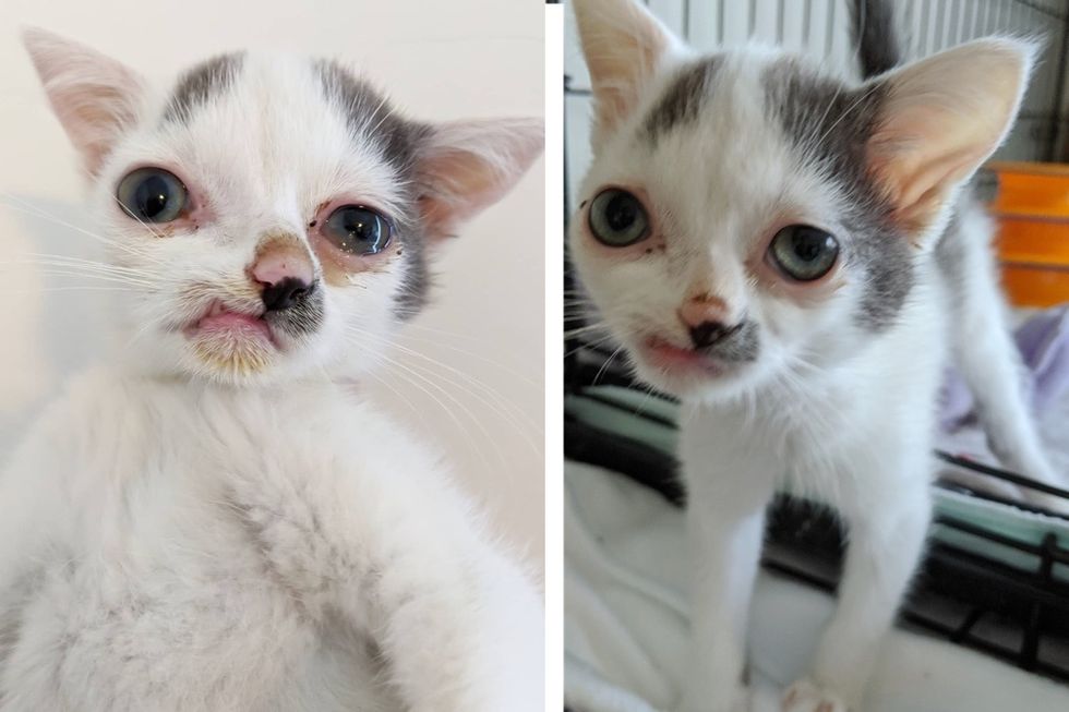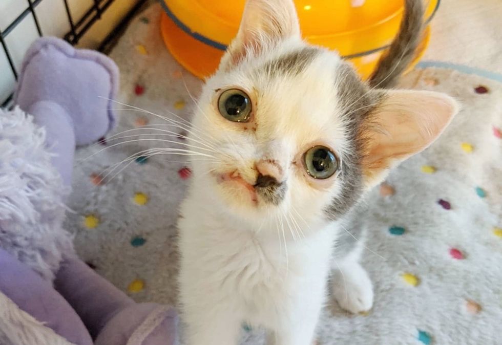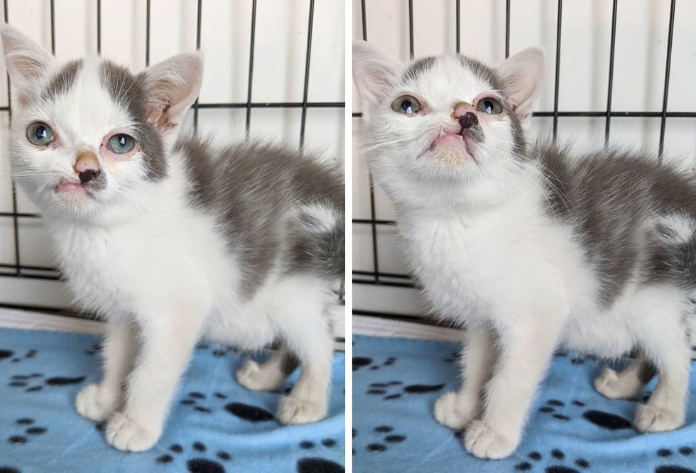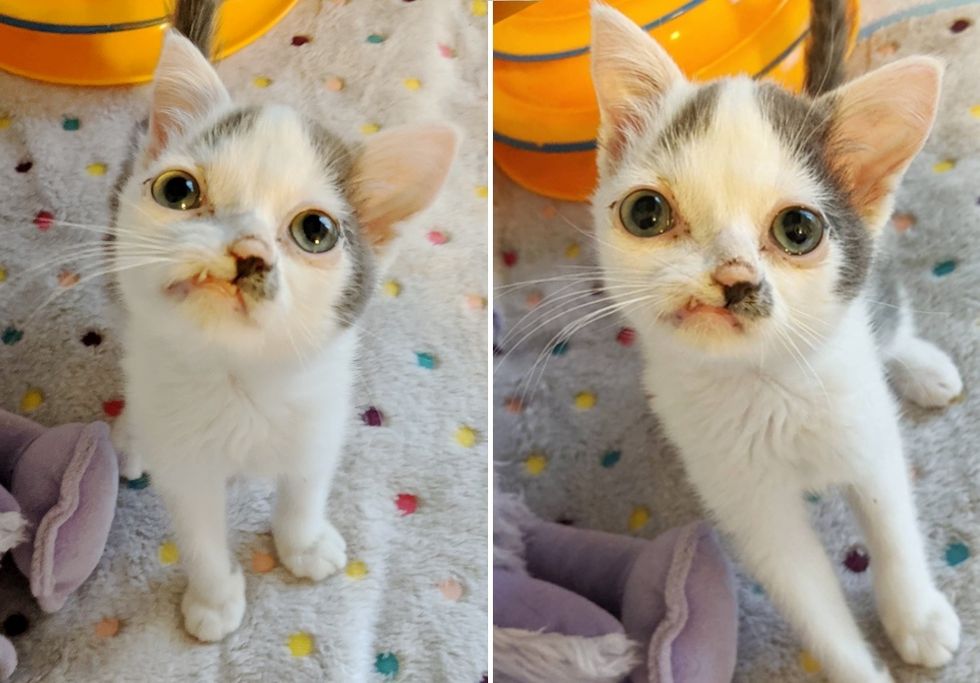 A pint-sized kitten with a unique face is so happy to find the help he needs to thrive.