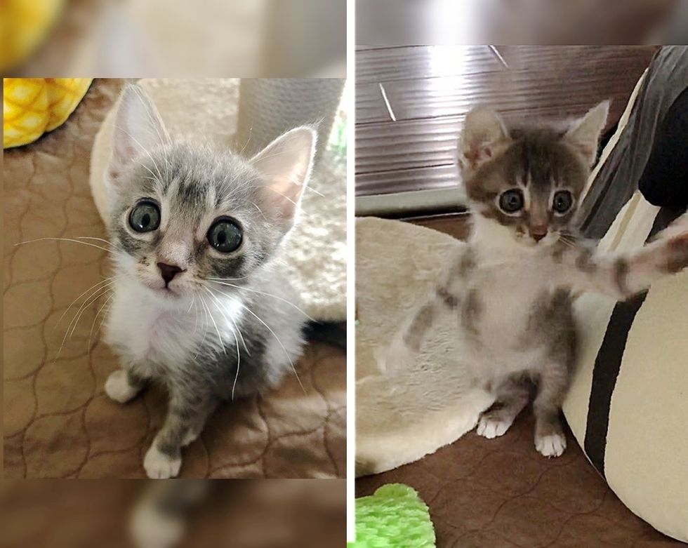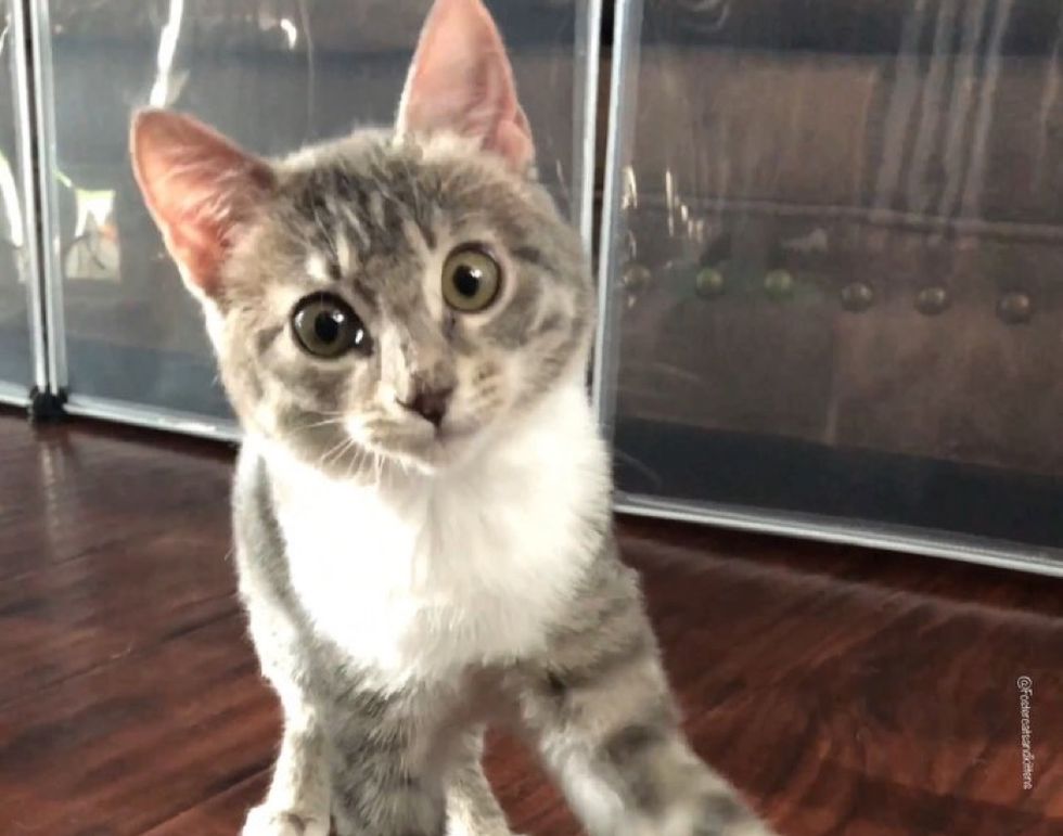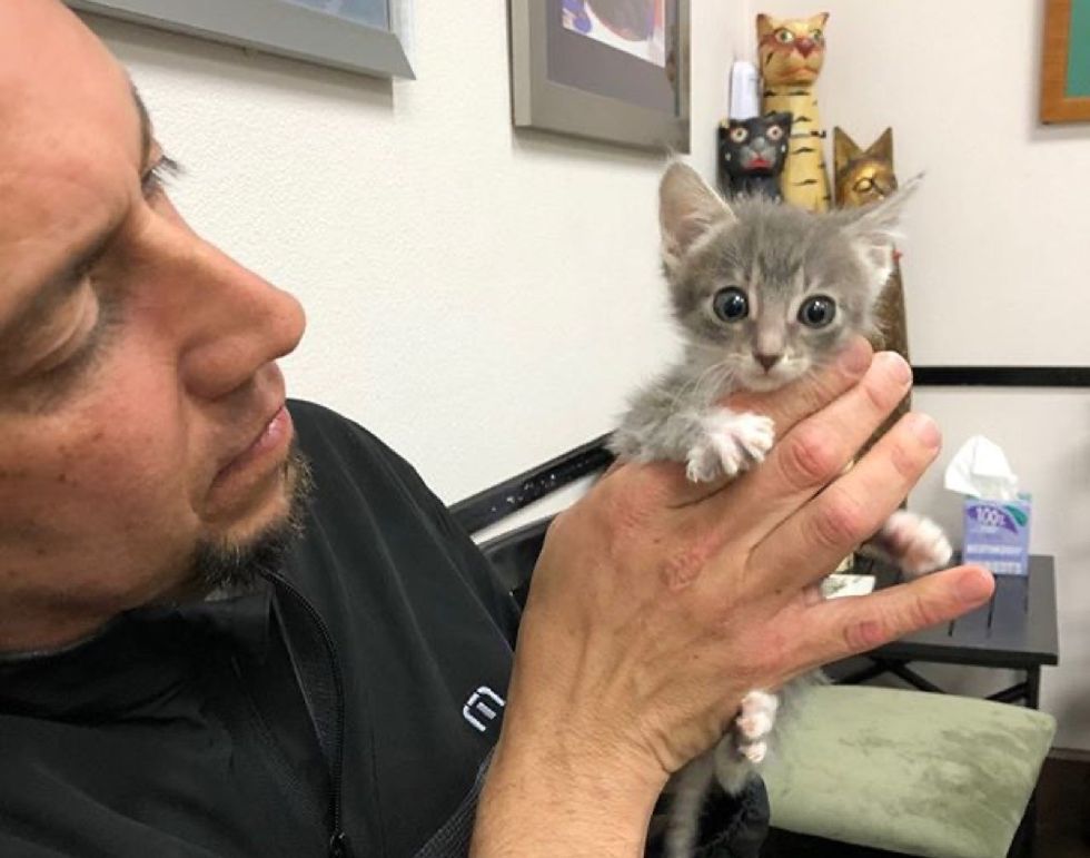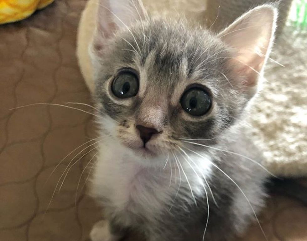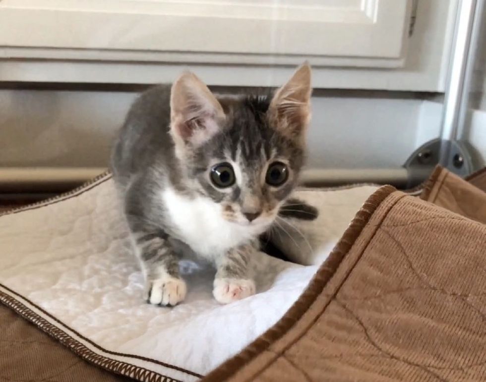A gray kitten was brought to a veterinary clinic in Las Vegas after she was found lying outside all alone. She was in very rough shape with a brain injury and unable to lift her head due to being severely malnourished and dehydrated.