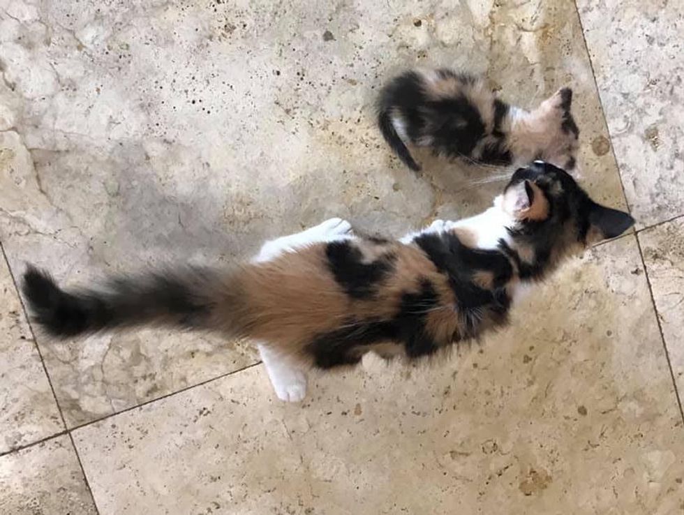 Recently, Carmen brought home a few kittens that needed foster care. One of them was a mini version of Toes. When the tiny calico climbed out of her nest one day, Twinkle Toes seized the opportunity and came running.