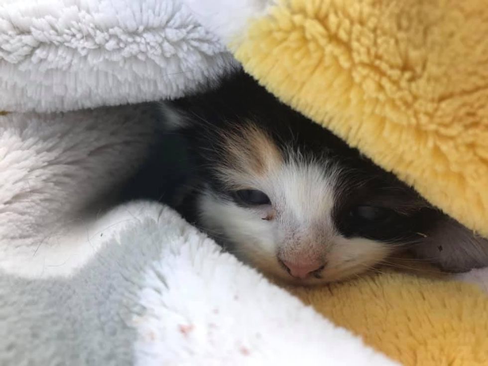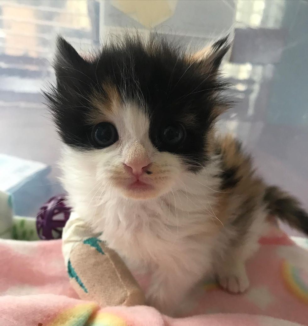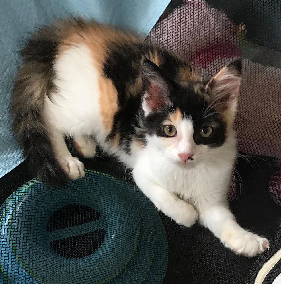 A worker was moving some planters when he spotted a calico with an injured paw. He brought the kitten to his coworkers and hoped to find her help. "Elsa (one of the coworkers) called me in a panic, asking me if I could come and get the kitten. I could hear the kitten crying loudly (in the background)," Carmen shared with Love Meow.
