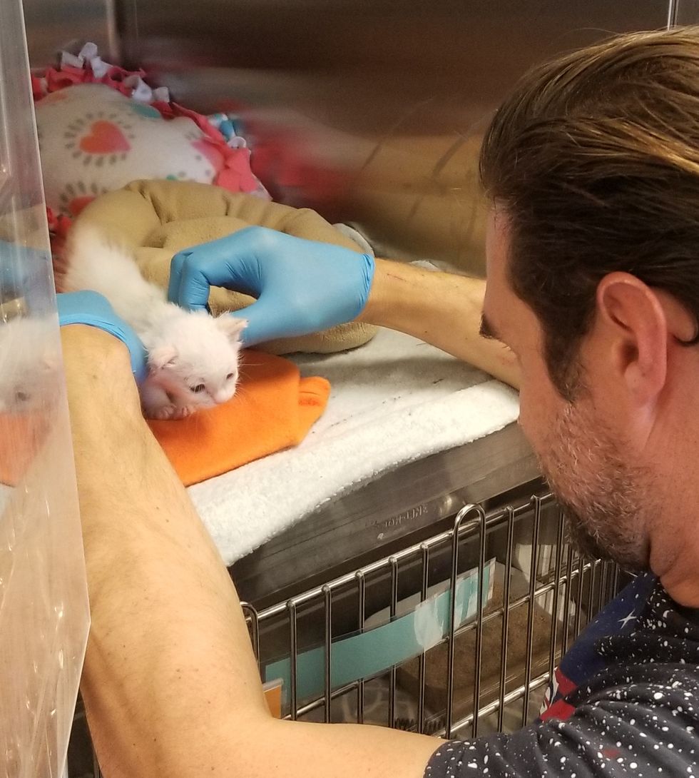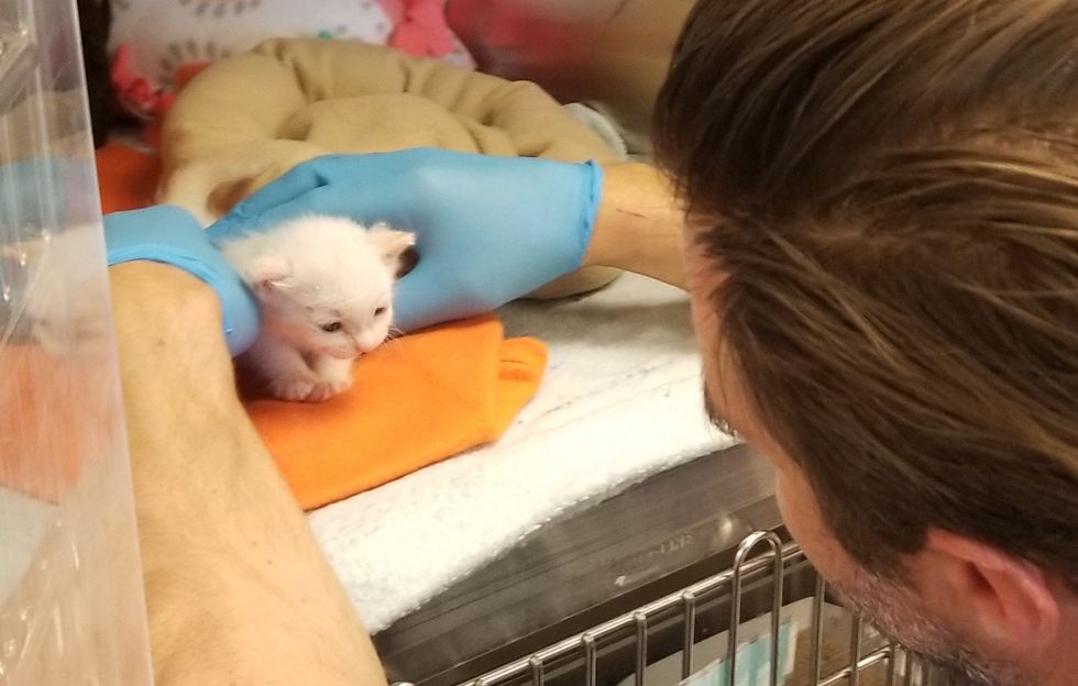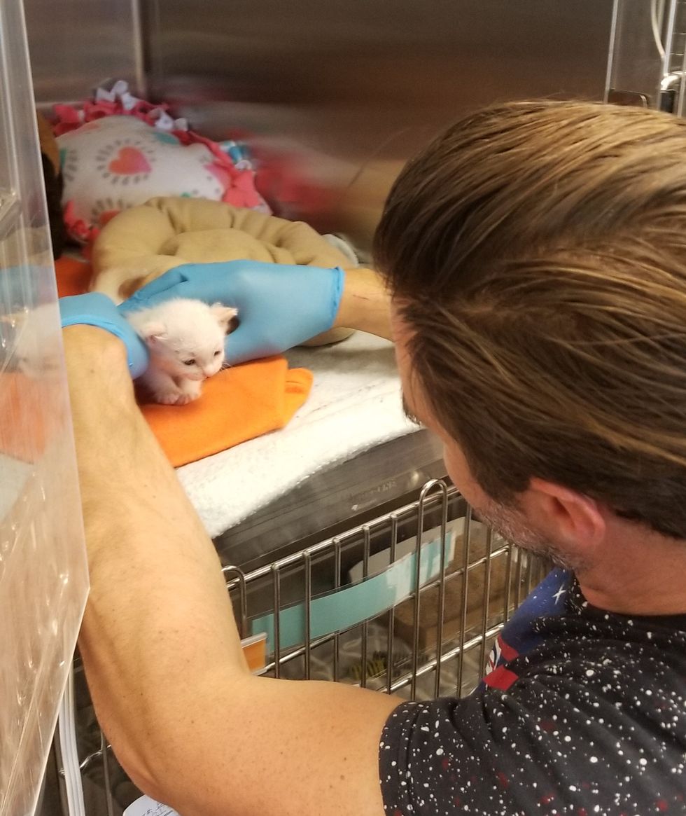 He handed the kitten over to Courtney Bean, a Cat Caregiver at Best Friends. "The wonderful nurse Courtney took him into the back. I started weeping from the stress of the day, but he was in the spot where he'd get his best chance at survival," Cameron said.