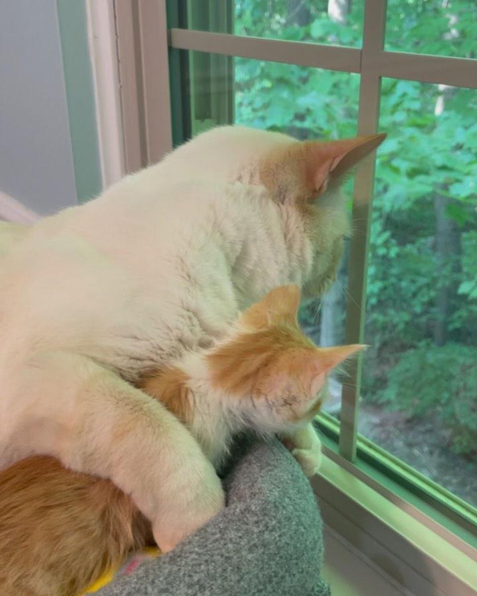 Squirt enjoys spending time with Bear by the window, watching cat TV. When they are not cuddling with each other, the ginger boy will try to play with Bear's tail -- his favorite toy.