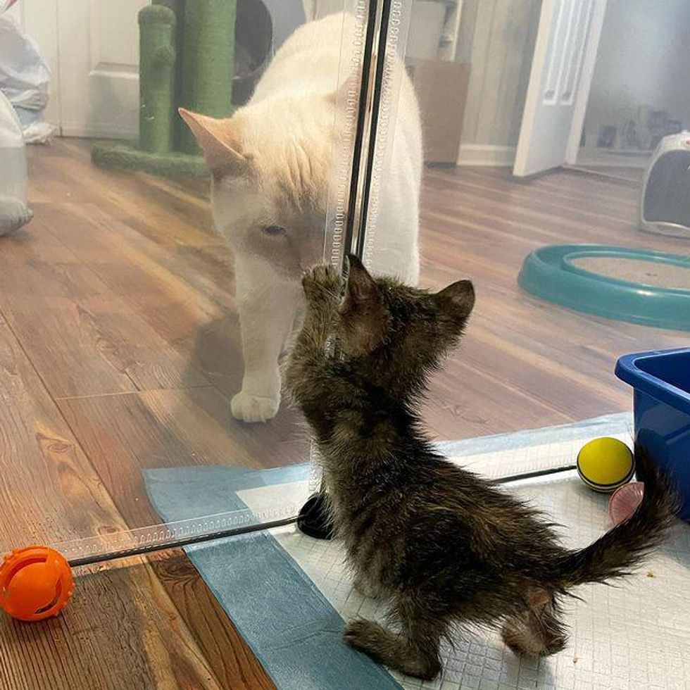 A kitten who was rescued along with his sisters, took a liking to a family cat and turned into a stage five clinger.