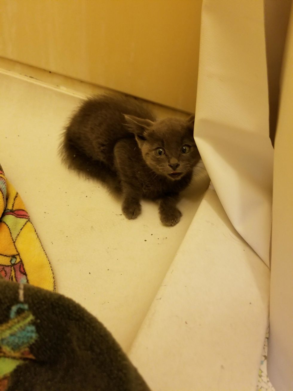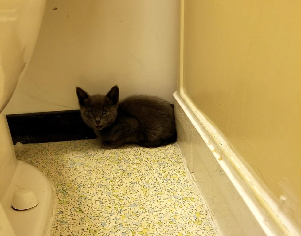 They placed him in a quiet bathroom, gave him a litter box and plenty of food and water. As soon as they left him alone, the kitten gobbled up all of the food and promptly used the litter box.