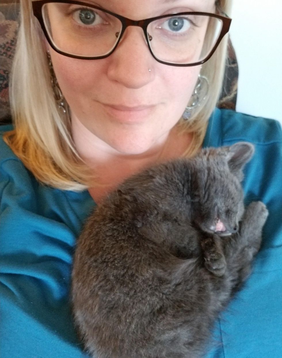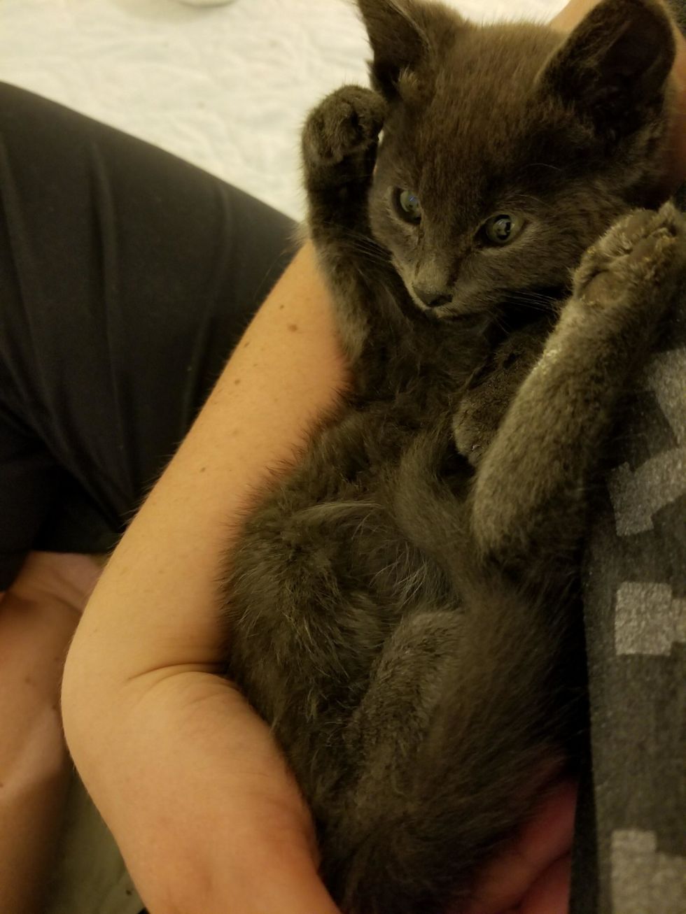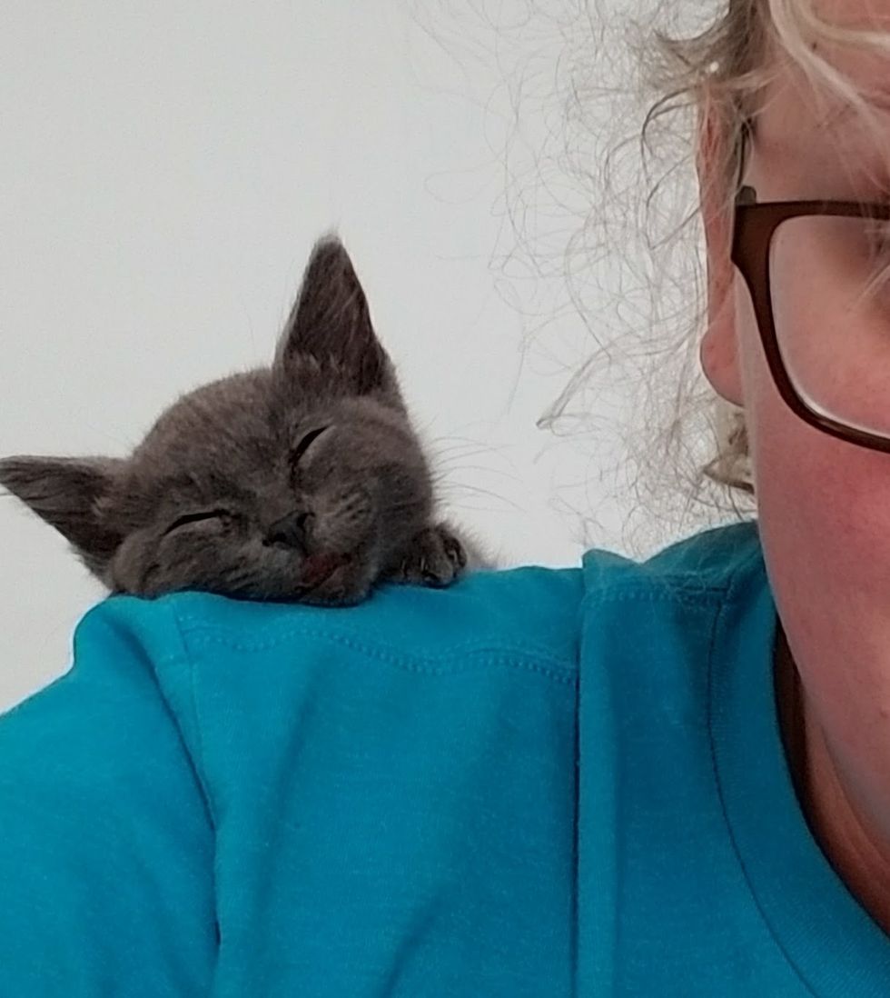 The kitten who was so frightened when they first found him, has turned into a snugglebug.