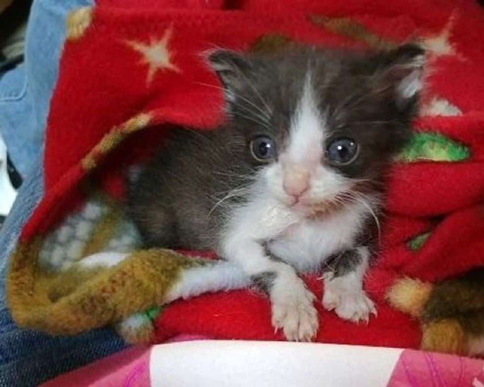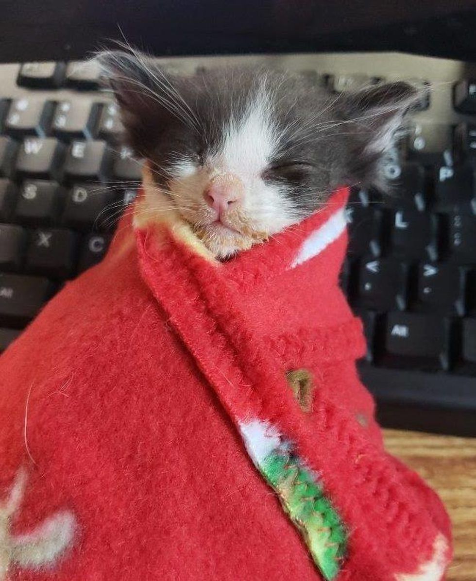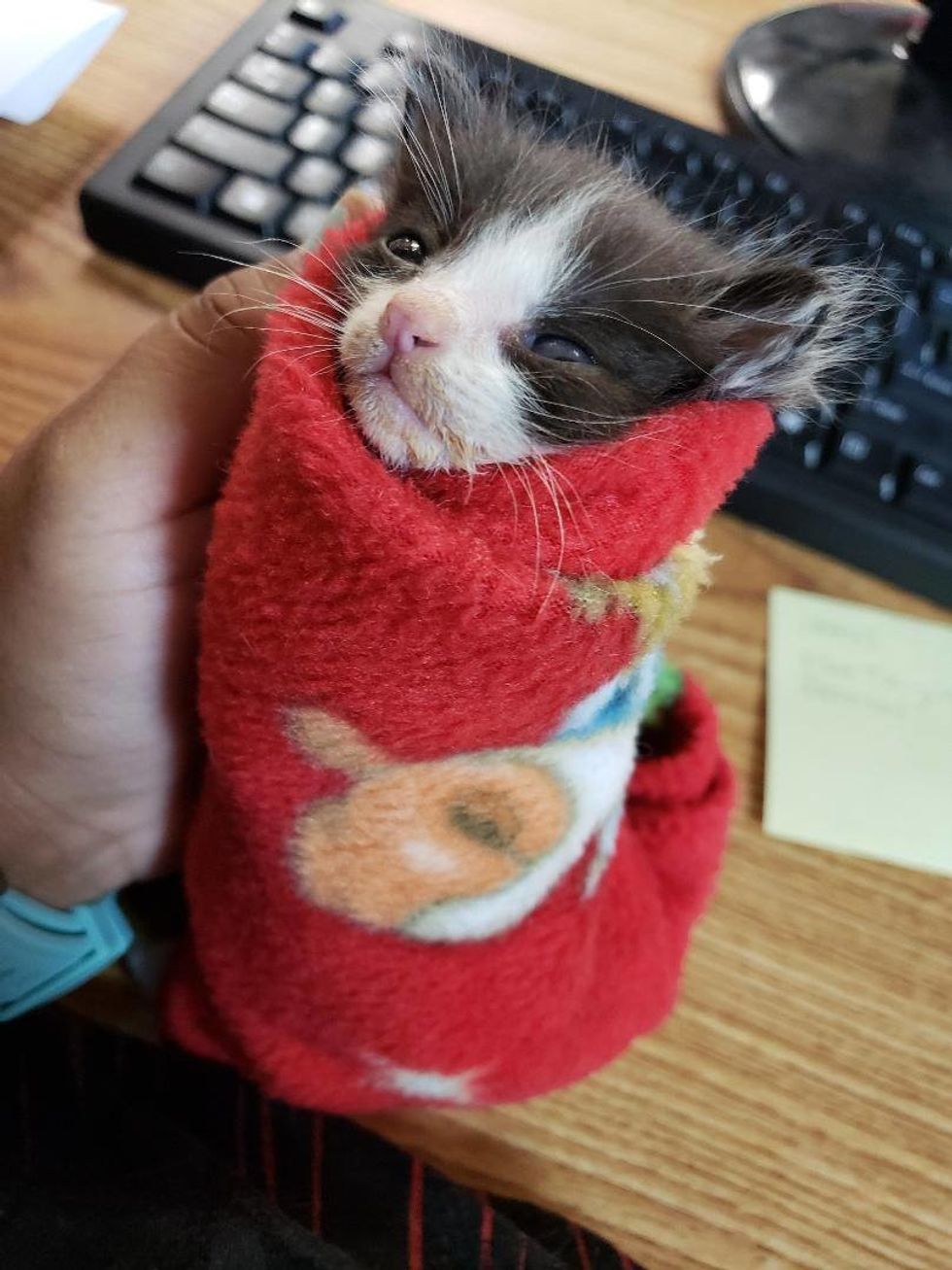 A tiny kitten who was rejected by his cat mom, found comfort when a volunteer of a cat rescue swaddled him in a warm blanket.
