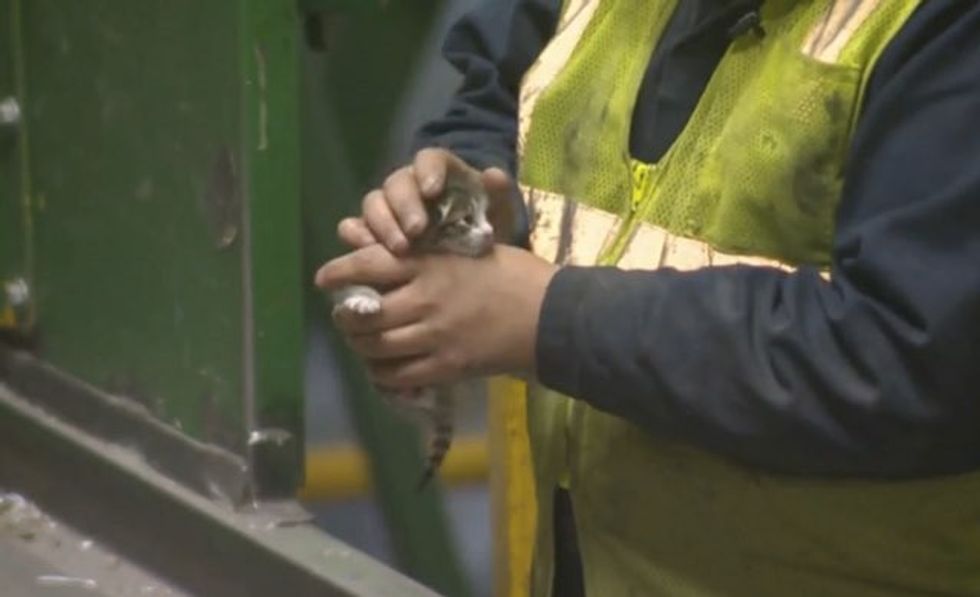 Just before falling into a running compactor, Tony Miranda saw the kitten and immediately scooped her up. He was puzzled by how the kitten got in with the trash. The palm sized tabby had survived a ride in a dump truck, traveled onto the conveyer belt and just got pulled out seconds away from death.