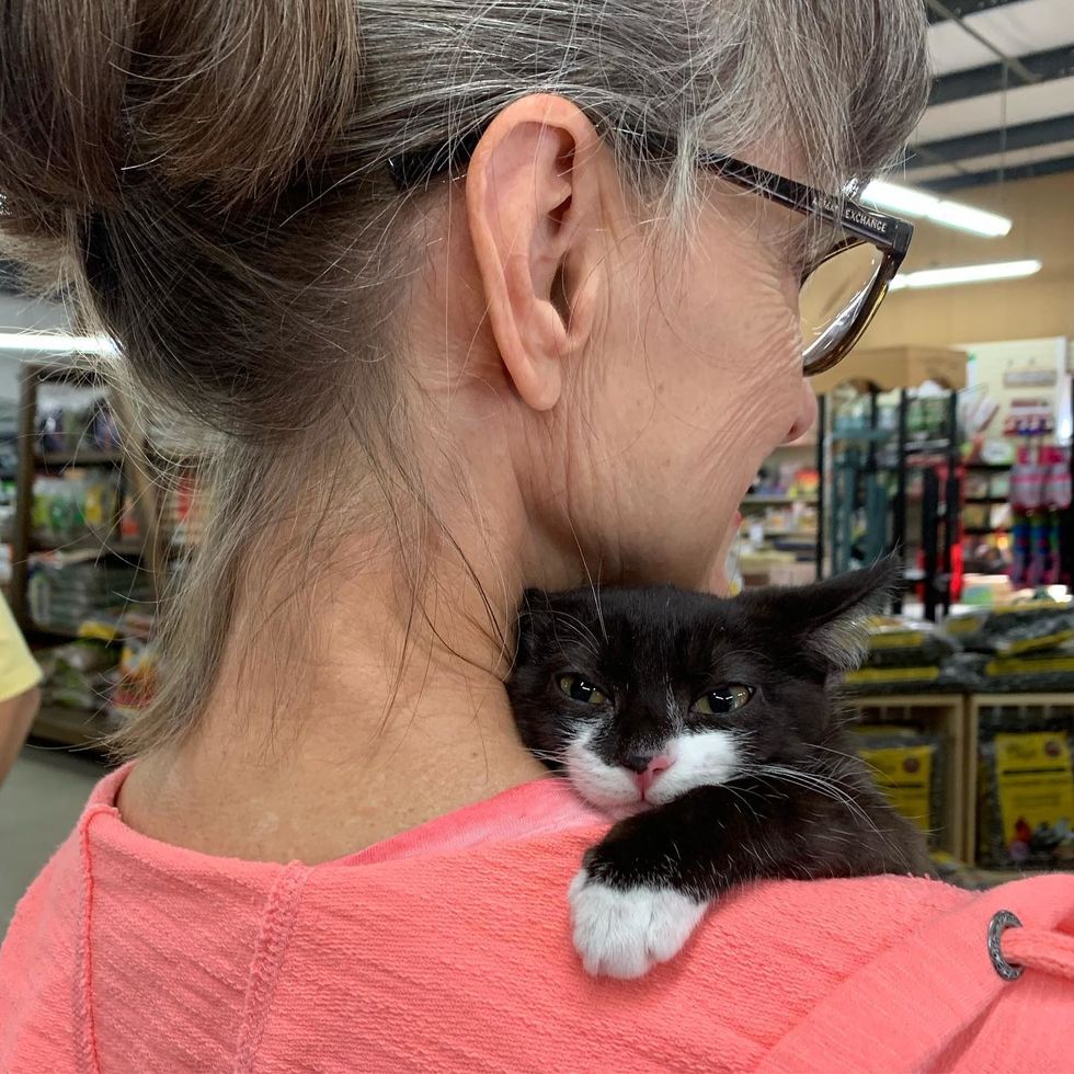 The sweet tuxedo immediately melted in the embrace and began to relax. She didn't want her human to put her back and nuzzled up on her neck as if to say, "take me home."