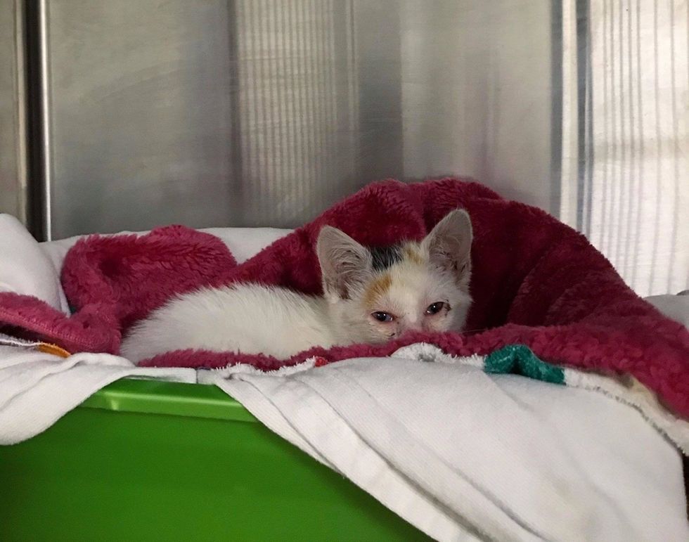 After three days, she got the young cat and brought her inside. The kitty was hungry and in rough shape with a severe upper respiratory infection.