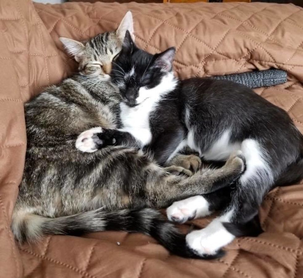 Poppy has come out of her shell with help from the one-eyed tuxedo. She still doesn't like to be picked up but has learned to trust. "She is completely content snoozing the afternoon away on a warm lap."