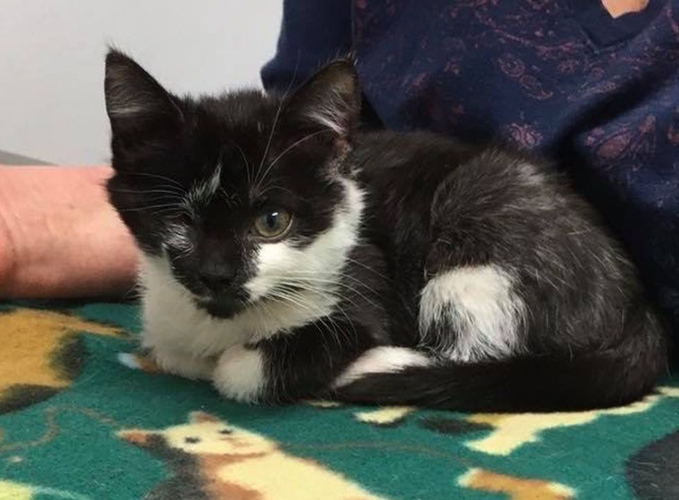 Around the same time, another kitten came to the rescue with a similar background. Phoebe, a tuxedo, and her brother lost their mom on the road and came to the rescue for a chance at a better life. She was in poor shape and had a severely infected eye which was later removed.