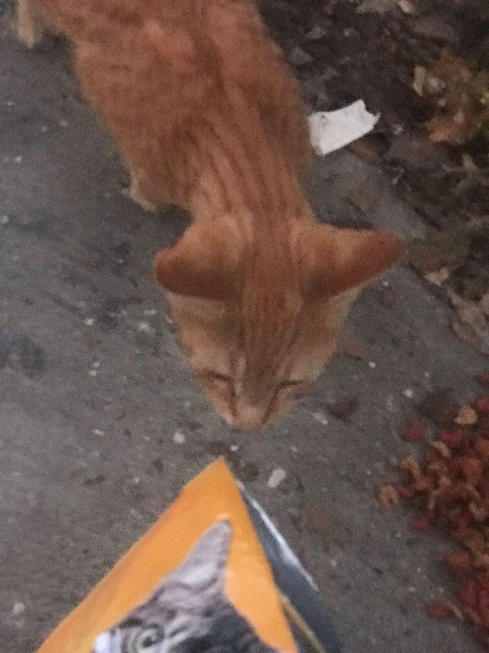The little feline immediately responded — he emerged from under the vehicle and came running towards the mother and daughter. After a quick sniff of the dry food, he didn't seem too impressed.