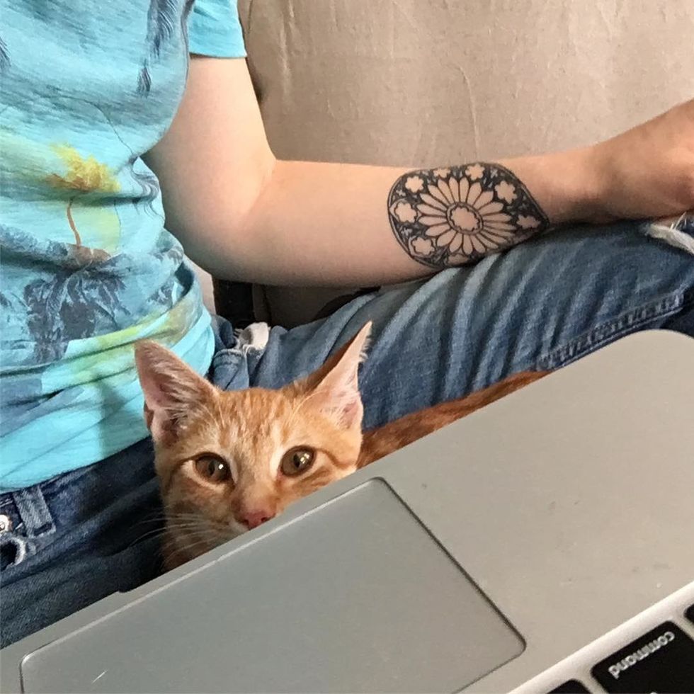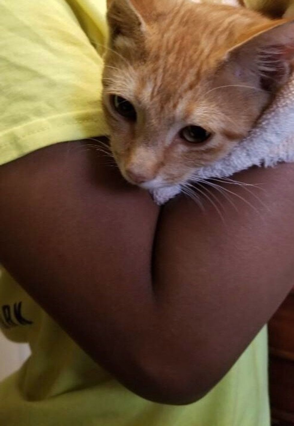 The kitten whom they named Red, moved into his foster home a few days ago, and quickly claimed his foster mom's lap.