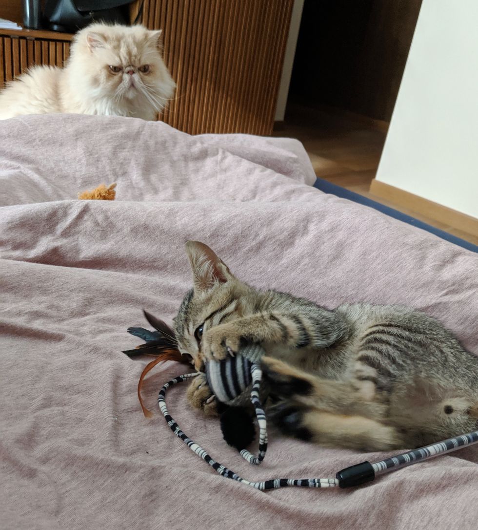 He has met one of his new feline siblings, Ferguson, who is very intrigued by this bundle of energy.