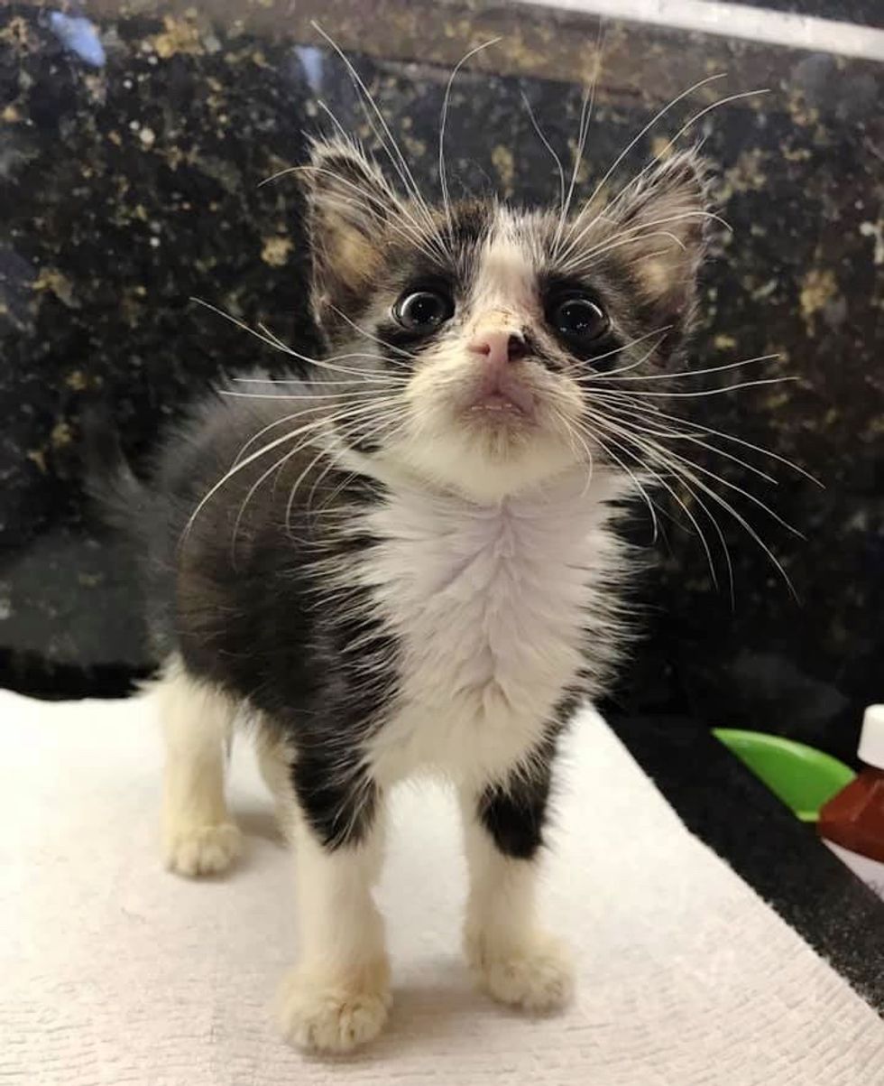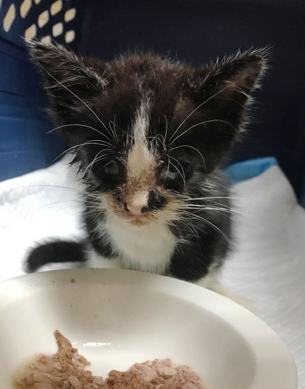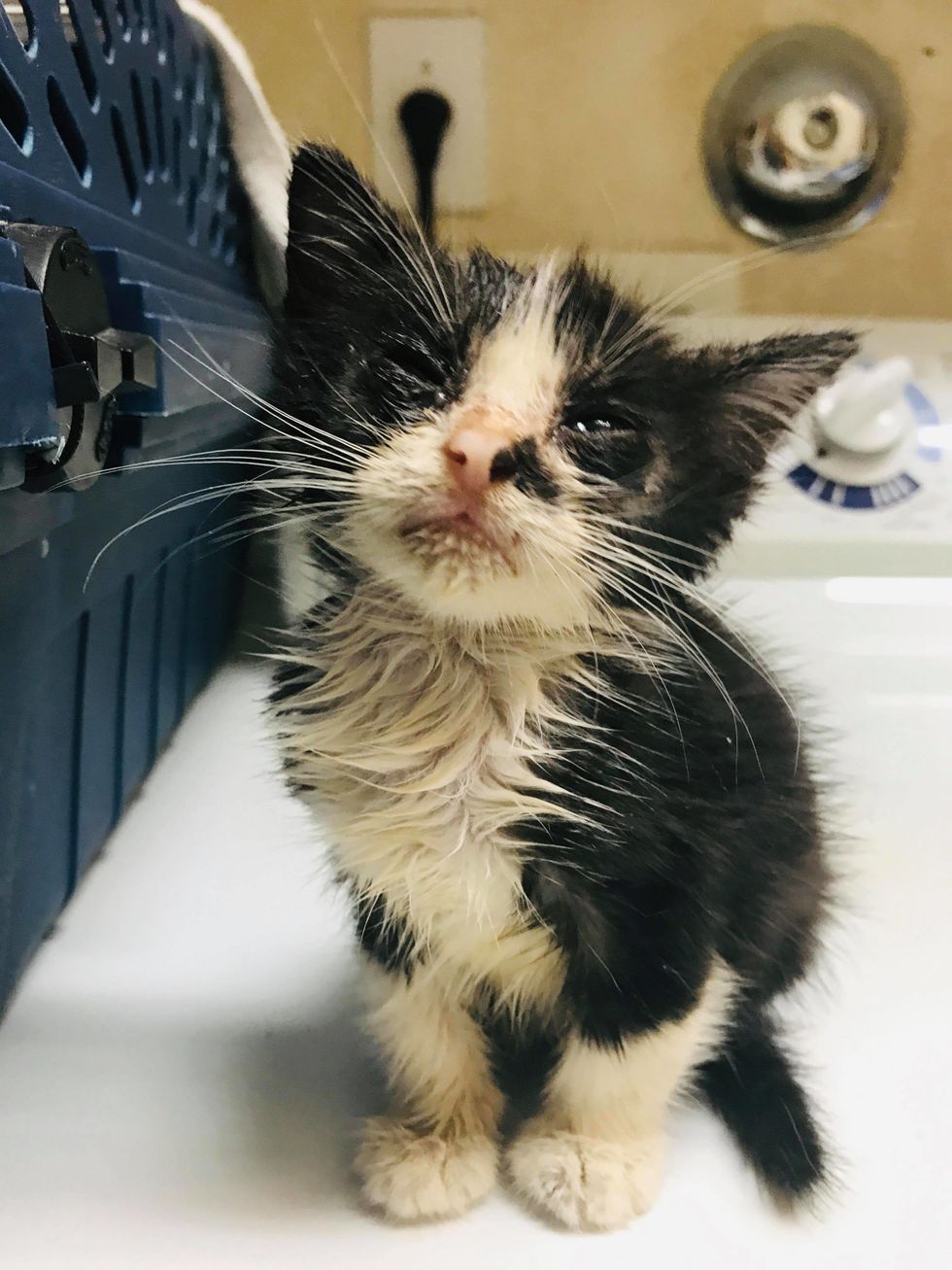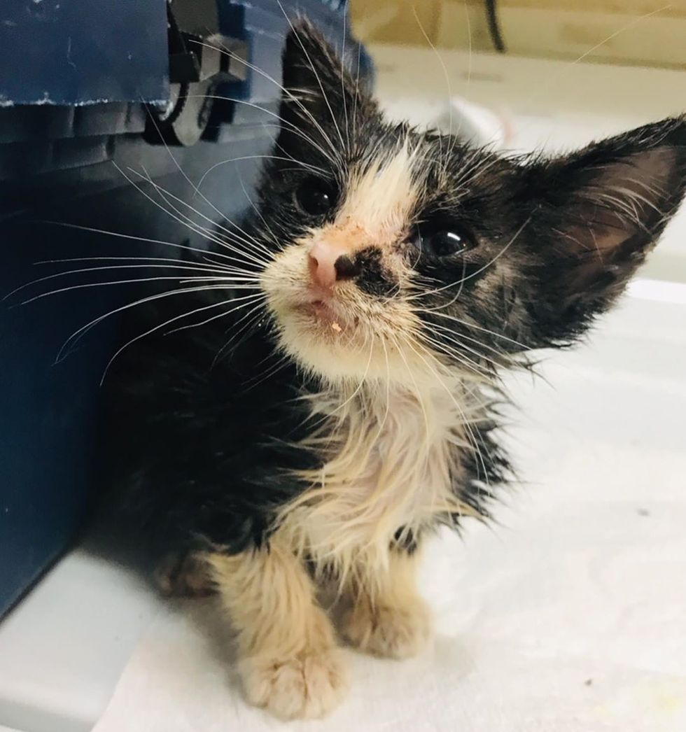 The tiny tuxedo was in rough shape — he couldn't see well due to an eye infection, had mange (a skin disease) and some GI issues.