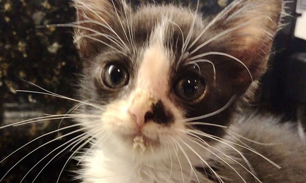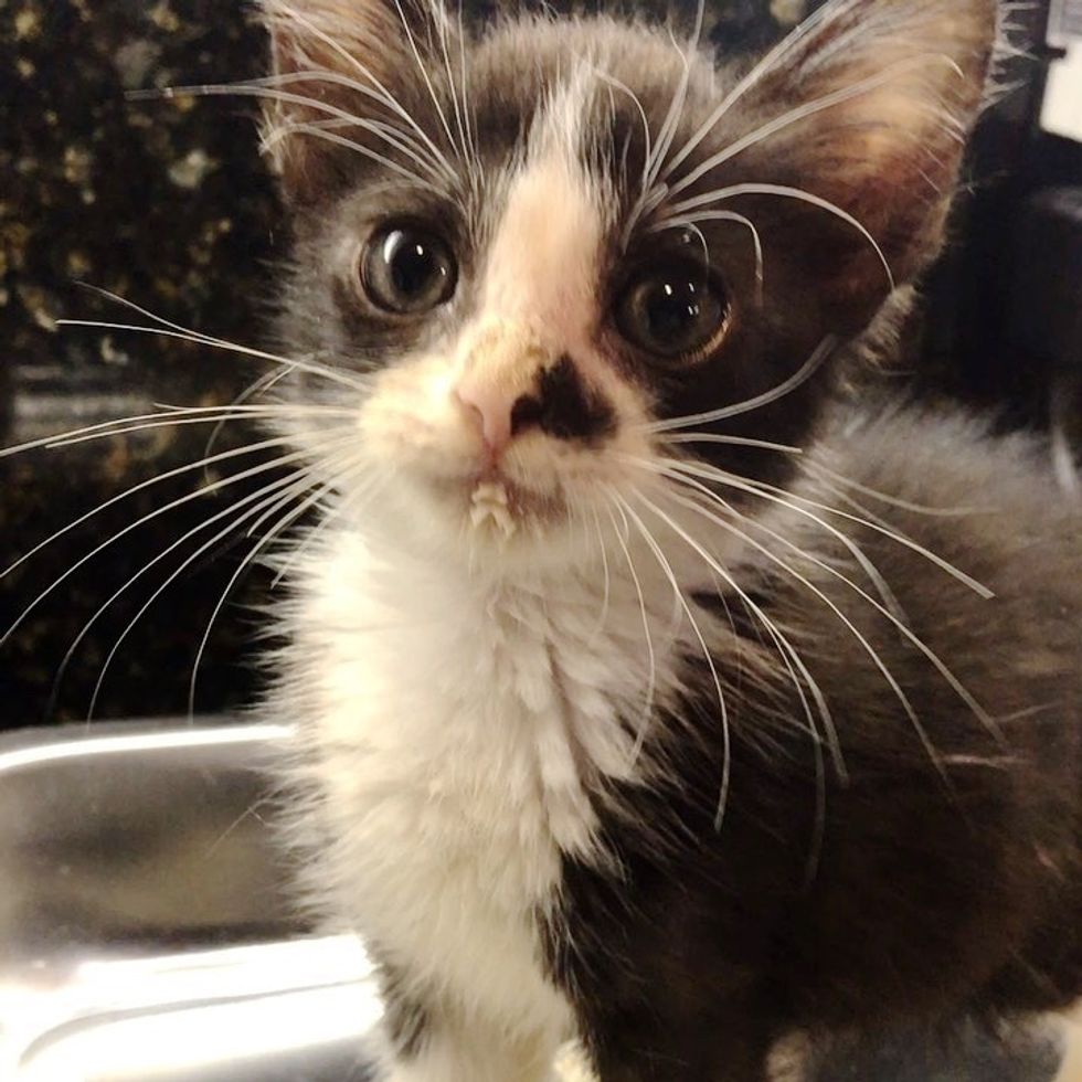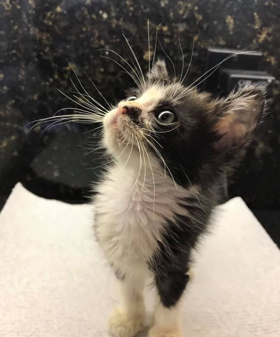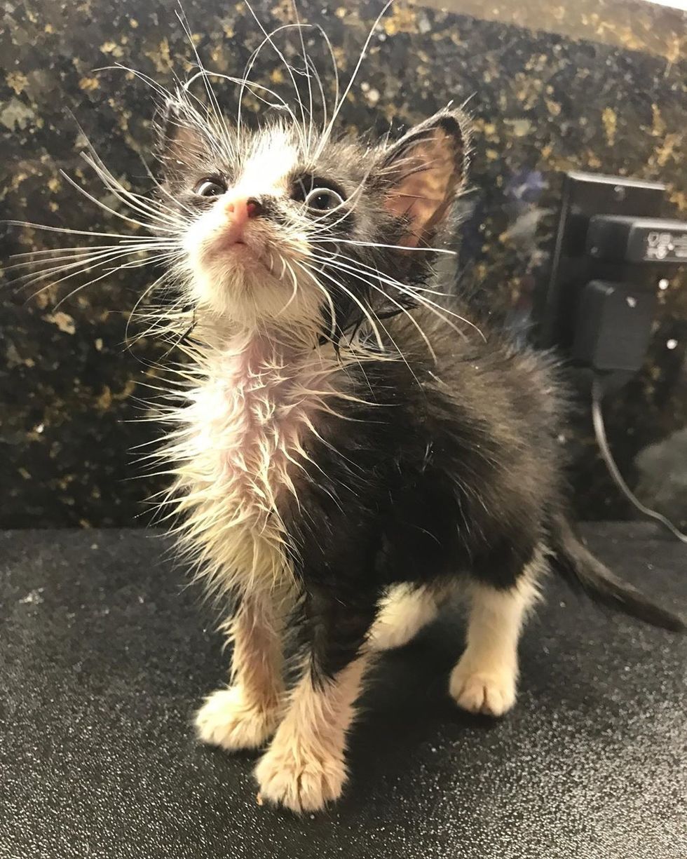 The tiny tuxedo was in rough shape — he couldn't see well due to an eye infection, had mange (a skin disease) and some GI issues.