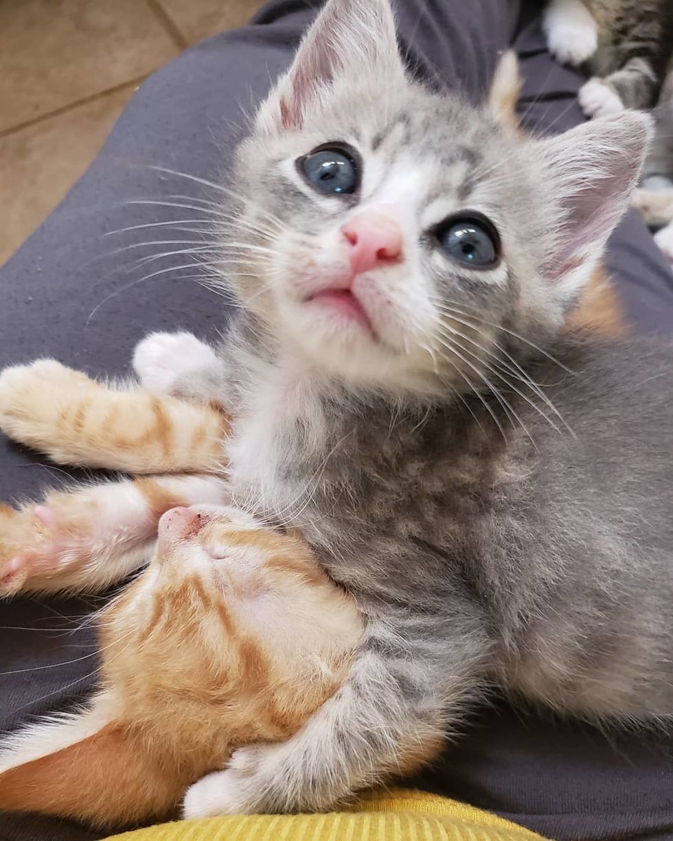 He adores other foster kittens, especially when they join him for a cuddle-fest.