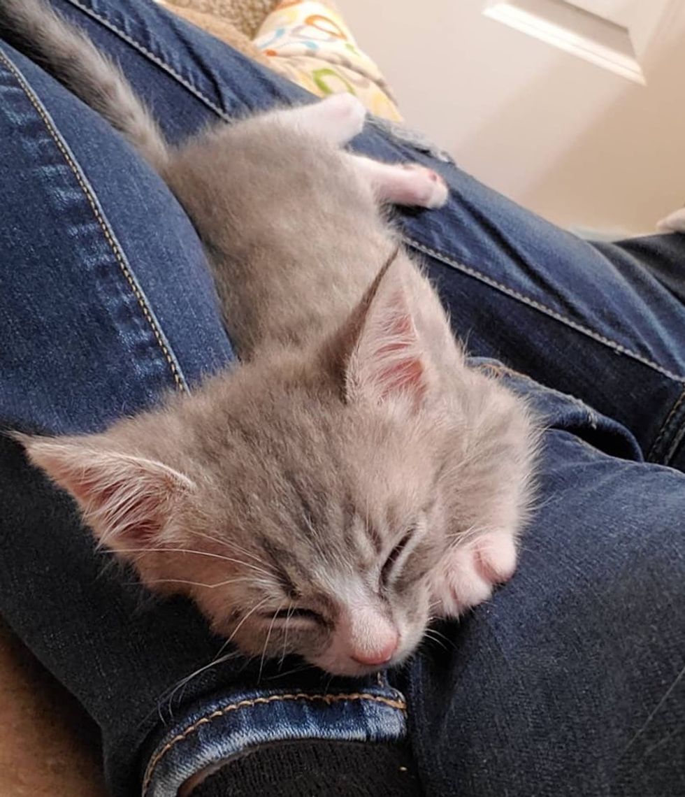 He would crawl onto Jen's lap after a long day of playing, and quickly go to sleep as if he had an instant snooze button. Being in a warm lap and cuddled made him the happiest kitty in the world.