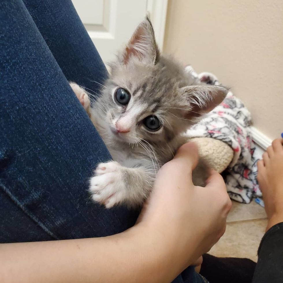 Wrenn Rescues was contacted as the kitten was in need of round-the-clock care. Ashley Kelley, a foster volunteer, stepped up to help. The little singleton needed friends, so a few days after arrival, Ashley paired him up with a litter of four.