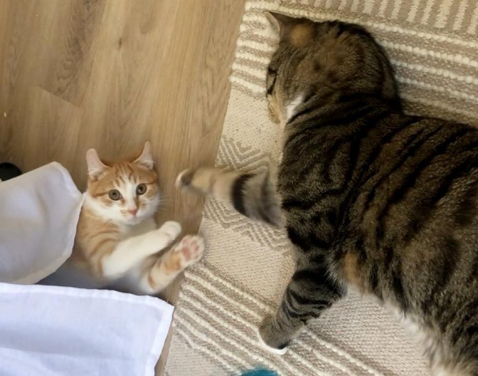 Once the door was opened, the orange tabby walked right up to Marley and insisted on a meet-and-greet. Marley wasn't so sure about this over-zealous kitten at first, and turned away to maintain some personal space.