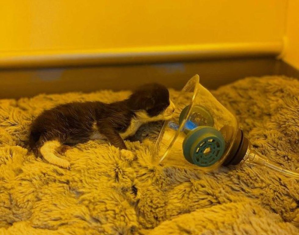 Due to his cleft palate, Muppet needs to be fed safely through a feeding tube every two hours to prevent aspiration. He stays in a cozy incubator that regulates his body temperature, and has oxygen supply handy to help strengthen his lungs and ease his breathing.