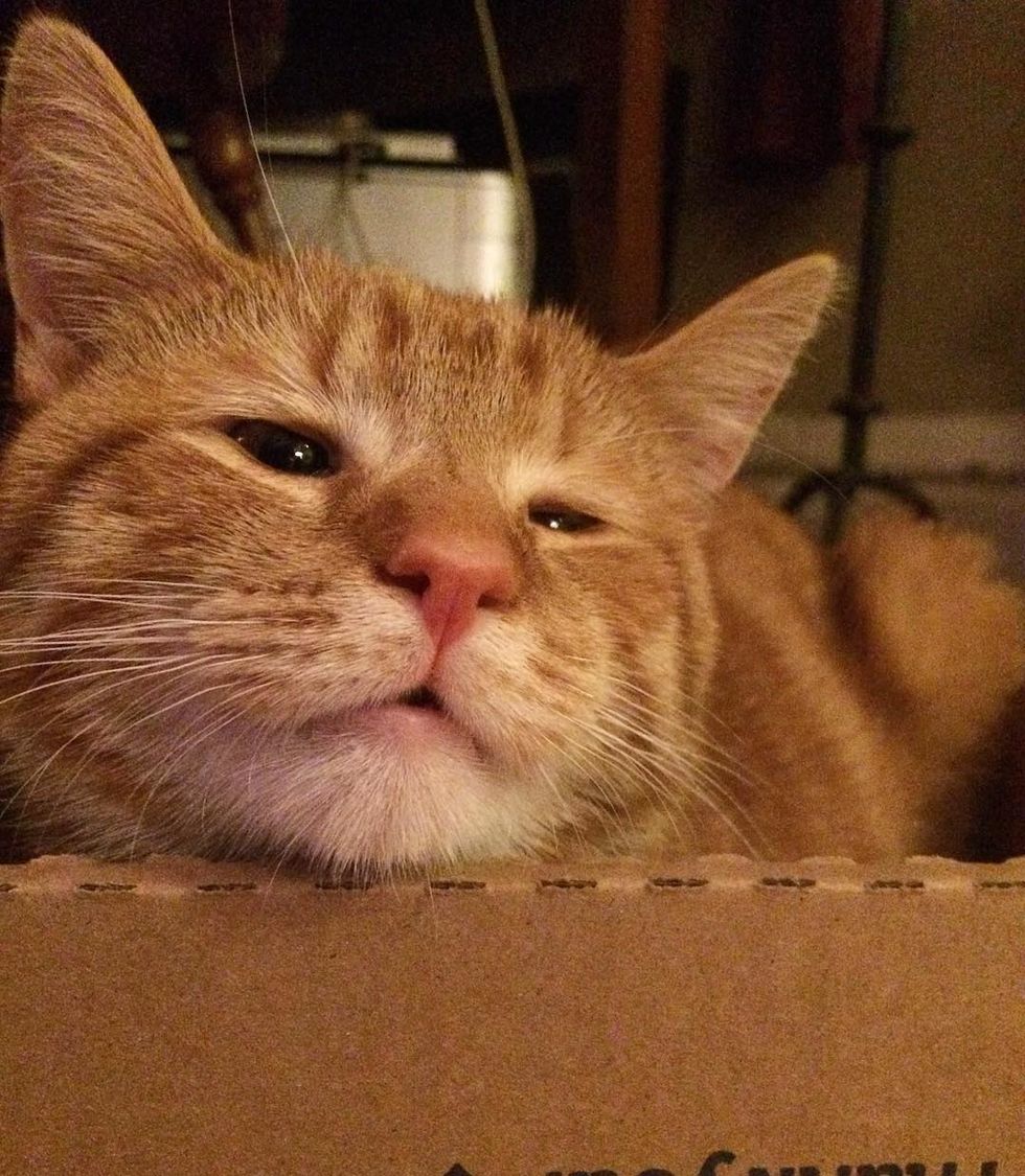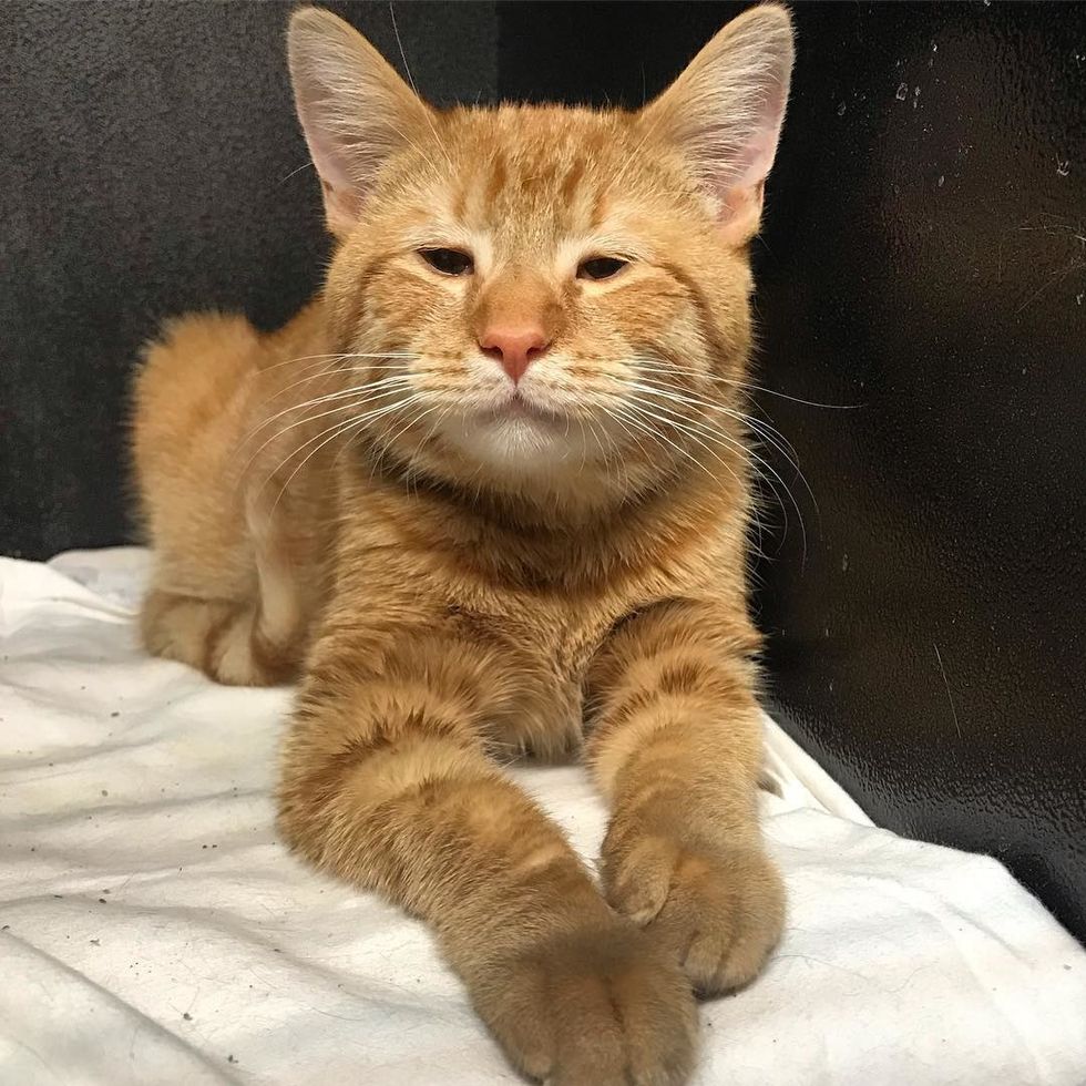 Right away, they noticed his perpetual frown, but the kitty wasn't sad at all. He was born with a congenital condition called microphthalmia, in which the eyeballs are much smaller than normal.