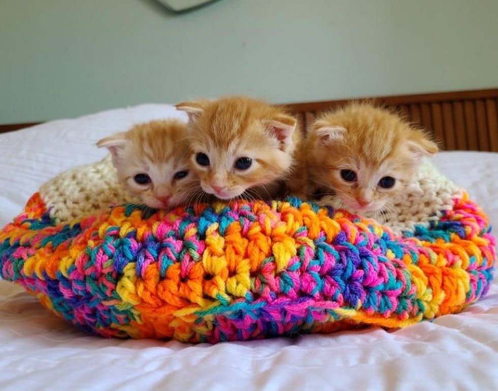 At three weeks old, the triplets are thriving. They like to show off their chonky bellies, and their feet constantly go in all directions. The feline sisters and their friends are starting to learn to waddle.