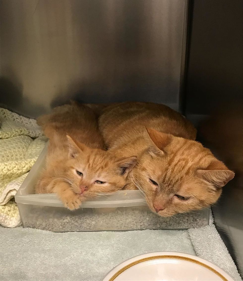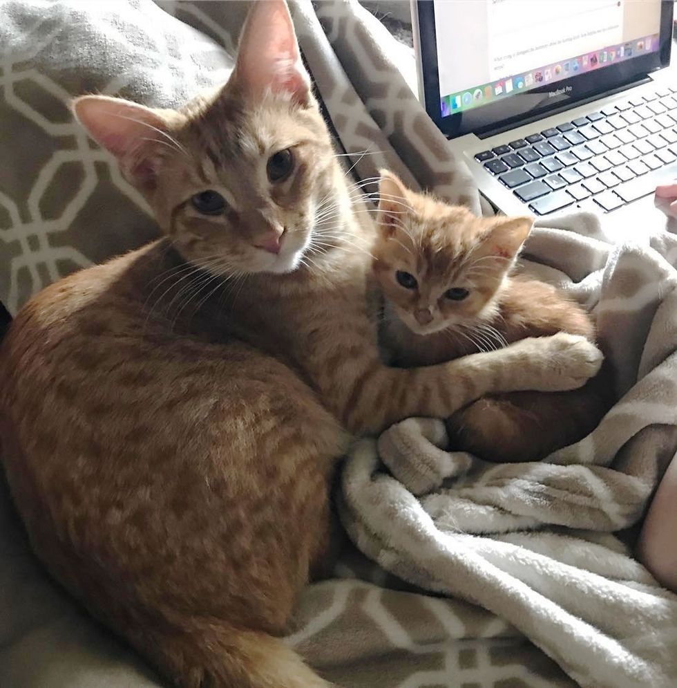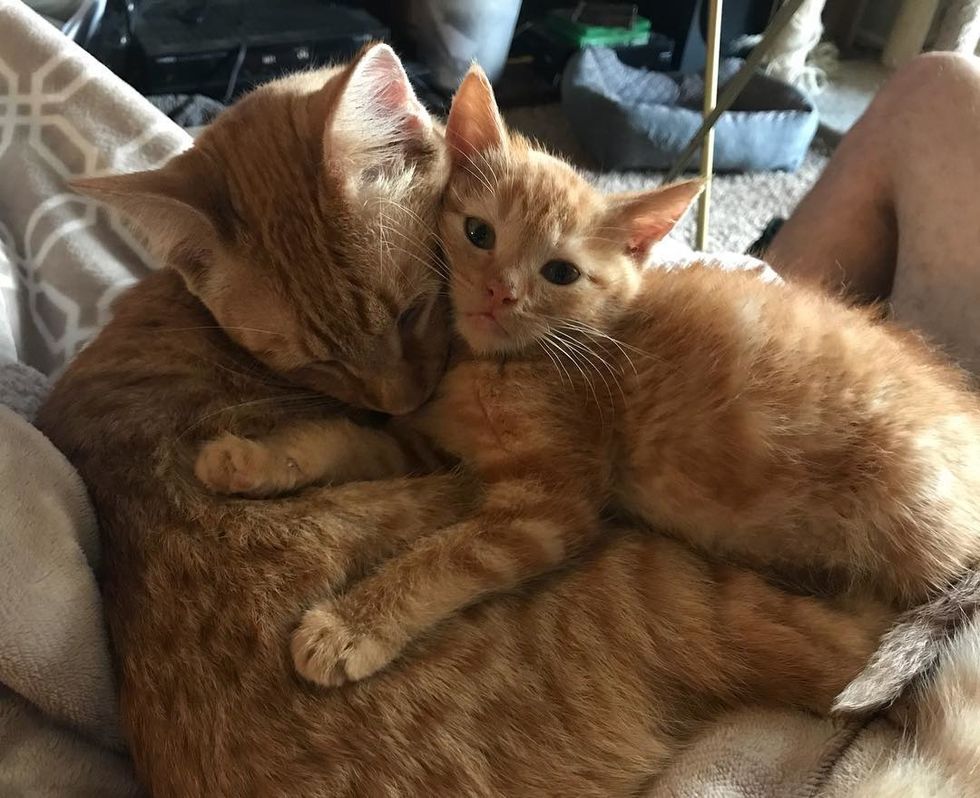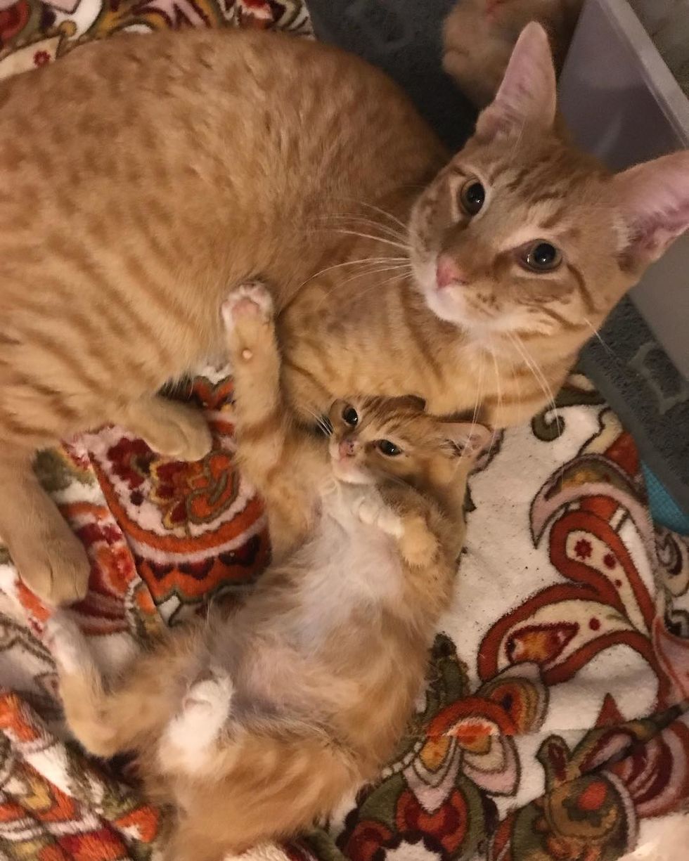 Leo kept the feline babies clean by grooming them daily. Tini loved snuggling with his surrogate dad.