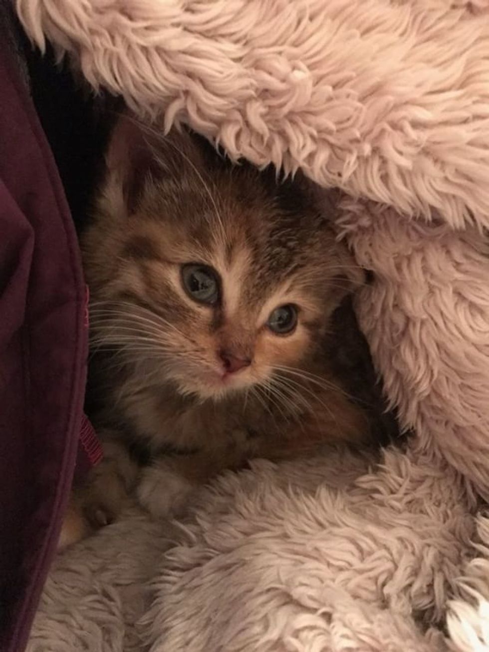 They saved this little kitten in the nick of time, and now she's loving her little castle made of warmth and fuzz :).