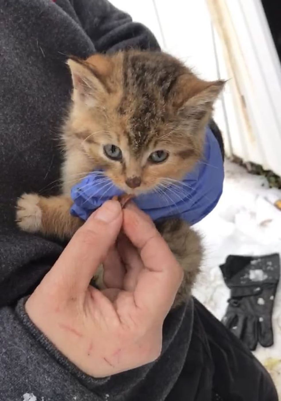 It was freezing cold. Once they freed the kitten, the rescuer held her close to her jacket to keep her warm.