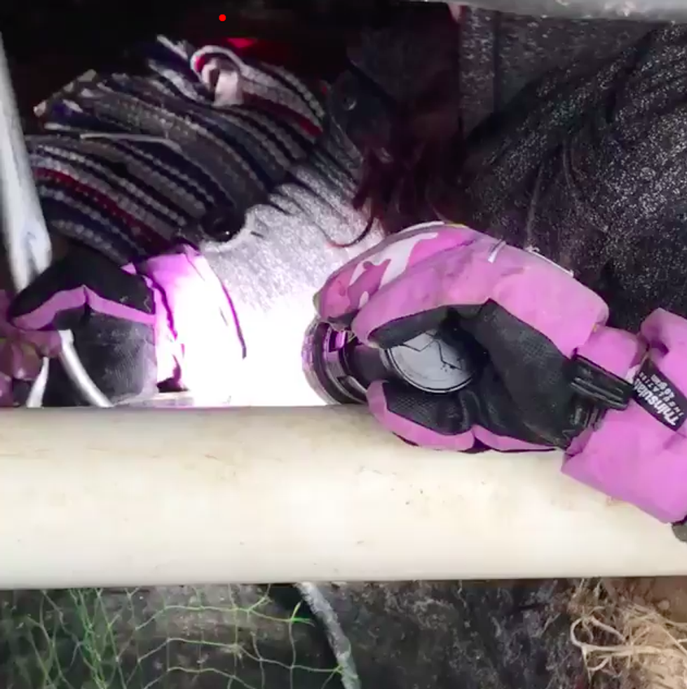 As they went under the trailer, they found two kittens trapped in a six foot deep hole in the ground. One of them had passed away. The surviving tabby kitten was exhausted from trying to climb up the hole. She couldn't grab onto the wall and slid down every time she tried.