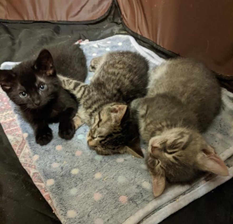 A rescuer went back to look for the cat mother but she was nowhere to be found. The feline trio, Delilah (tabby), Petunia (gray) and Sonny (black), received the medical care they needed, and were nursed back to health.