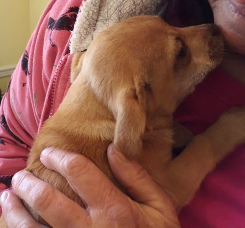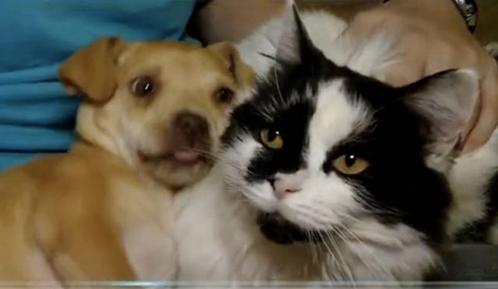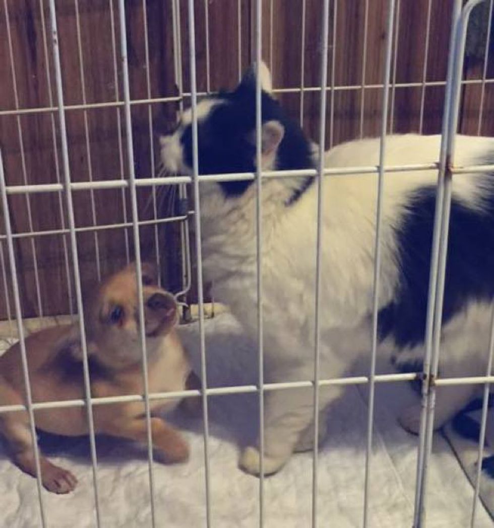 Star the puppy had a rough start to life and was in desperate need of love. When Stripe the cat met the little puppy, he hopped into her crate and started caring for her.